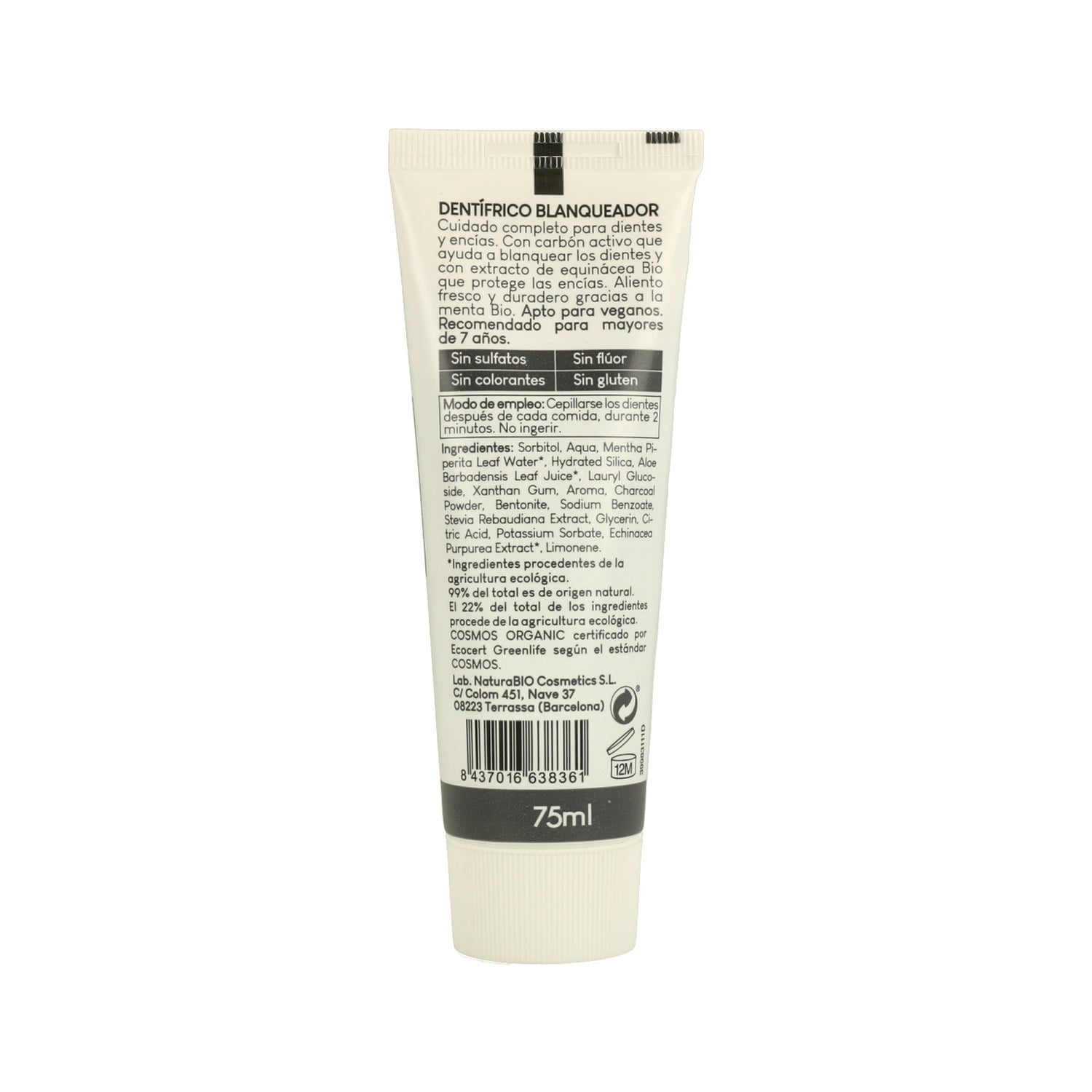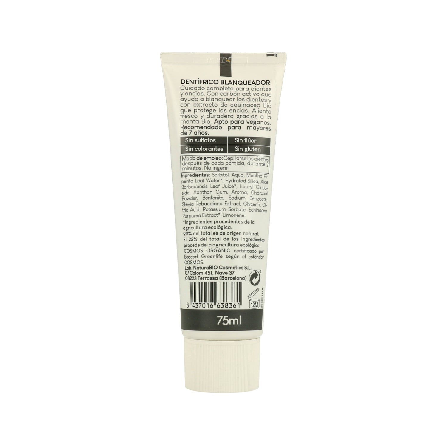 Dentifrice blanchissant au charbon actif pour un soin en profondeur des dents et des gencives en les blanchissant, en prévenant la formation de la plaque dentaire, en laissant une haleine fraîche et en détendant les gencives.