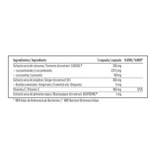 Complément alimentaire en capsules à base d'extrait de curcuma, vitamine C et gingembre. Contribue à la protection des articulations et aide à protéger les cellules de l'action des radicaux libres.