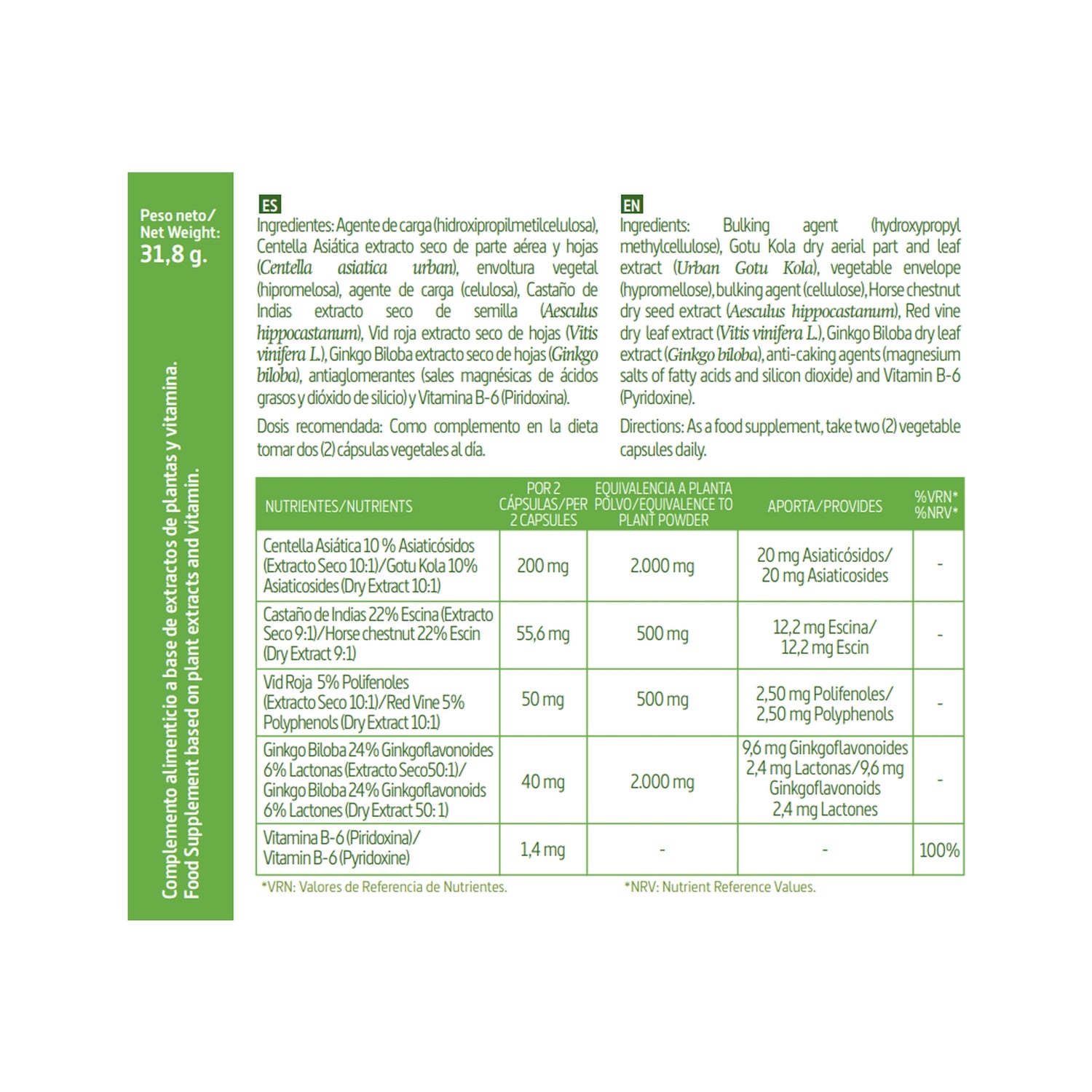 Agent de charge (Hydroxypropyl méthylcellulose), Extrait sec de Centella asiatica (partie aérienne) 100mg (Centella asiatica urbain), Agent de charge (Cellulose microcristalline végétale), Extrait sec de marron d'Inde (graine) 27,8mg (Aesculus hippocastanum), Extrait sec de vigne rouge (feuille) 25mg (Vitis vinifera L.).), Extrait sec de Ginkgo Biloba (feuille) 20mg (Ginkgo biloba), Agents anti-agglomérants (Stéarate de magnésium végétal et dioxyde de silicium), Vitamine B-6 (Pyridoxine) 0,7mg et Enveloppe végétale (Hypromellose : E464).
