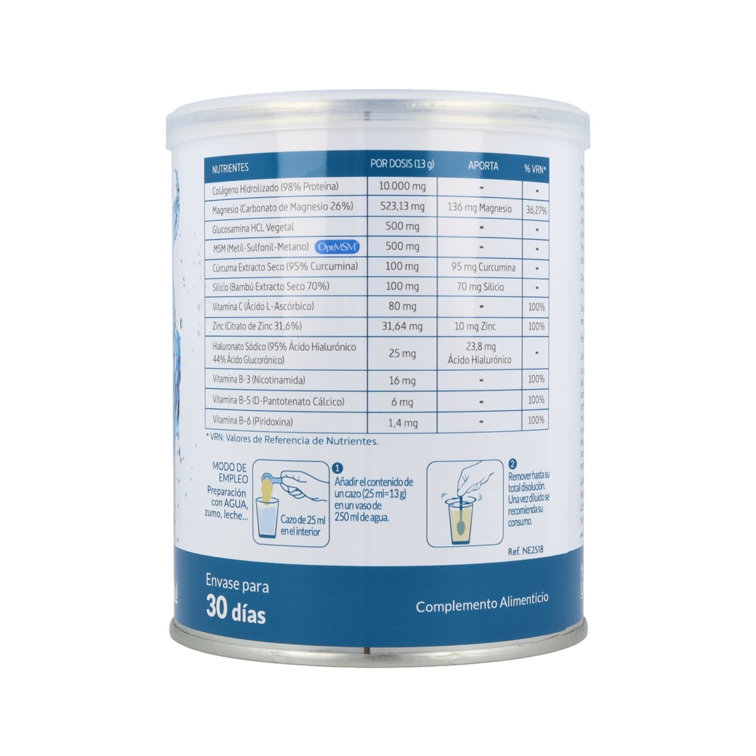 Complément alimentaire sous forme de poudre soluble et formulé avec du collagène hydrolysé, de l'acide hyaluronique et de la glucosamine, qui est indiqué pour aider à maintenir la flexibilité des articulations, améliorant ainsi la mobilité.