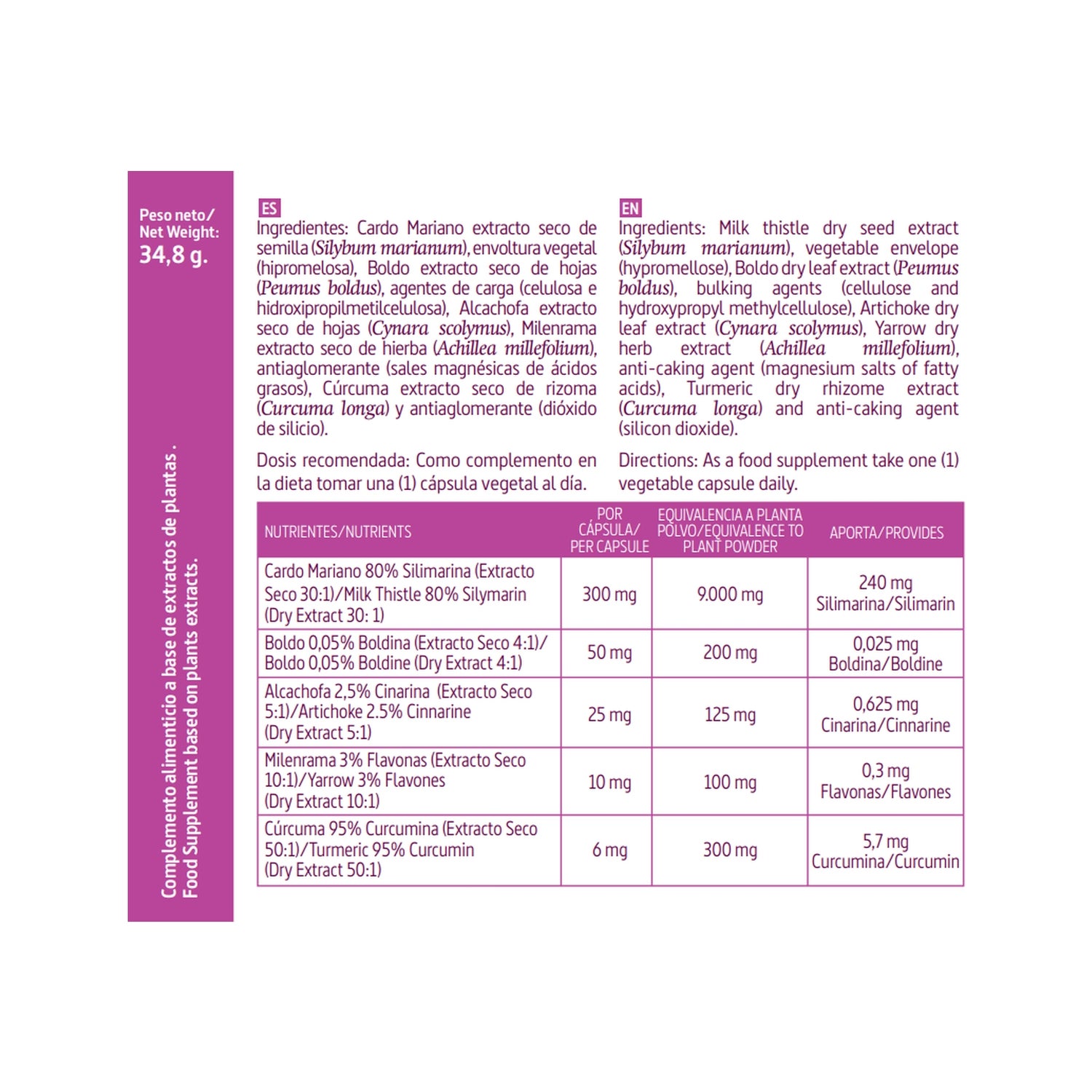 Complément alimentaire formulé à base de chardon marie qui contribue à la synthèse des protéines dans le foie, possède des propriétés anti-inflammatoires et favorise le développement de nouveaux tissus pour protéger cet organe des dommages générés par certaines toxines, améliore également le glutathion qui profite à la détoxification du système digestif. Les principaux avantages de ce produit sont d'aider le corps dans la régénération et la protection de la fonction hépatique, de prévenir la constipation, d'aider avec les flatulences, de contrôler le cholestérol, d'éliminer les graisses et de réparer le foie à des maladies telles que la cirrhose ou l'hépatite.