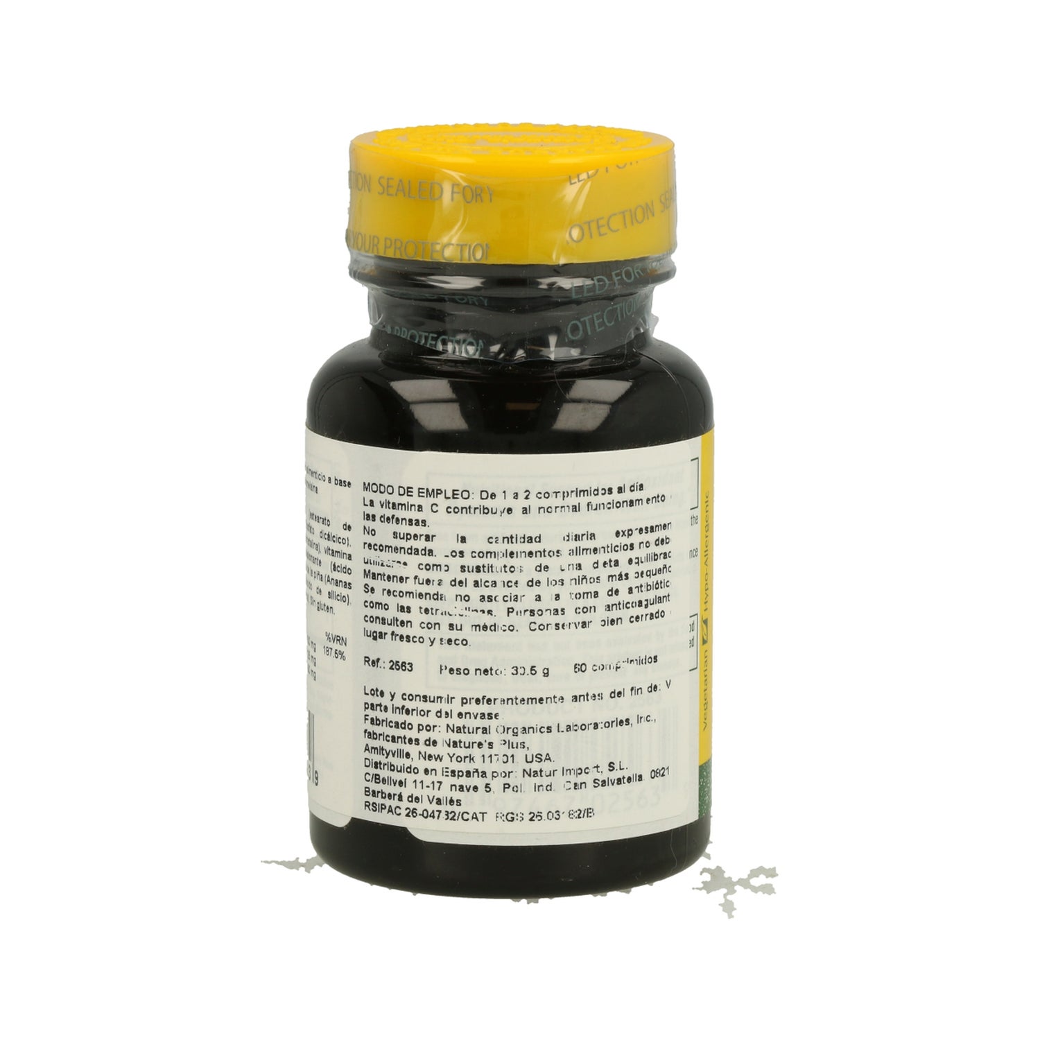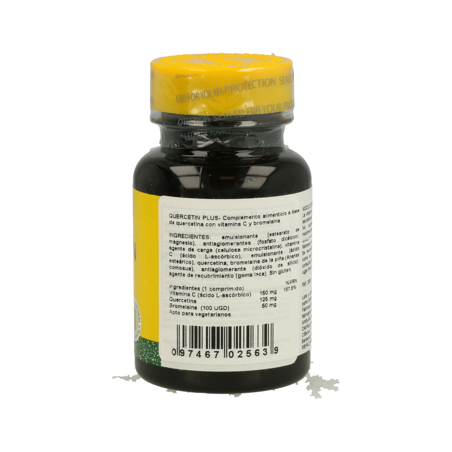 Bulking agents: microcrystalline cellulose. Vegetable cellulose, ascorbic acid (vitamin C), dicalcium phosphate, Quercetin. Firming agent: stearic acid. Magnesium stearate, bromelain. Gelling agent: hydroxypropyl methylcellulose. Anti-caking agent: silica. Coating agent: pharmaceutical varnish.IngredientsFor 2 tablets%IR*Vitamin C300 mg375% of the IRQuercetin250 mgBromelain (200 GDU)100 mg*IR: Reference Intake.