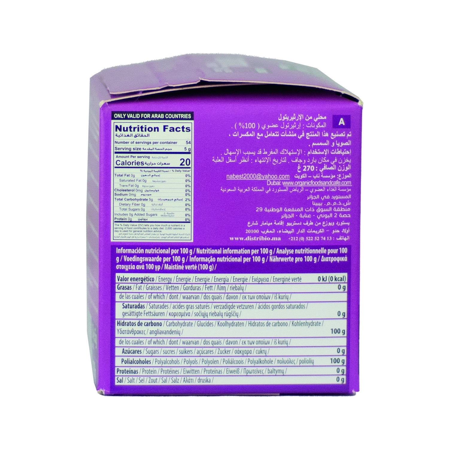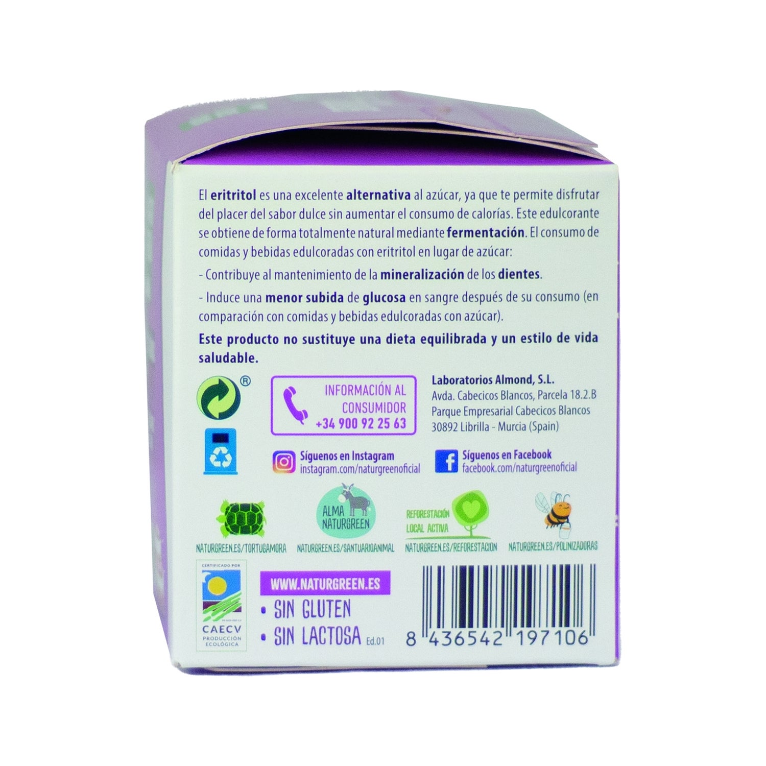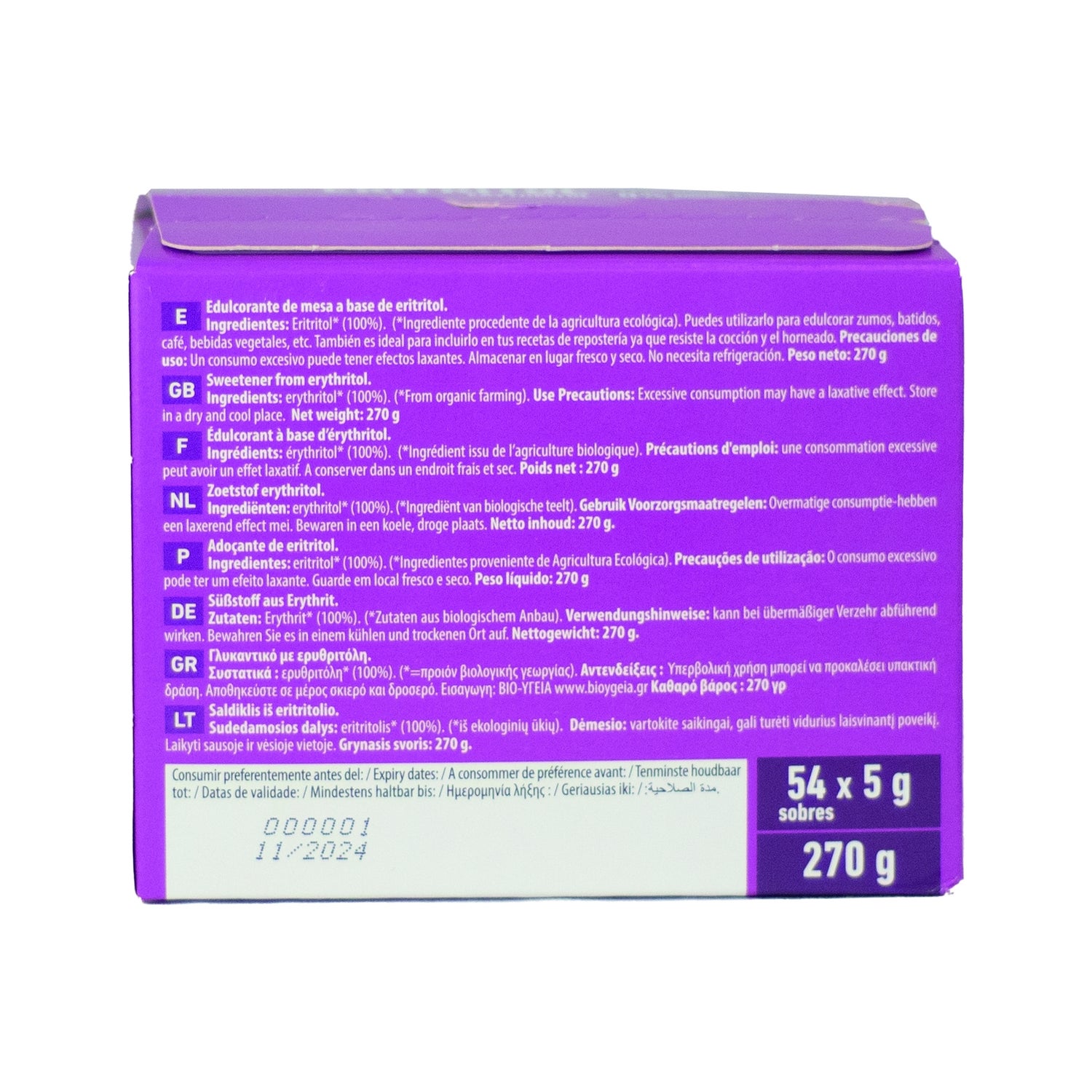 Édulcorant en poudre composé à 100 % d'érythritol, pouvant remplacer le sucre blanc et la saccharine. Il fournit un pouvoir sucrant jusqu'à 70% supérieur à celui des sucres traditionnels. C'est un composé à action sucrante, d'origine végétale, recommandé pour sucrer les jus, les smoothies, les infusions, les boissons végétales et le café. Il est également utilisé dans les préparations culinaires, car il résiste à la cuisson. Produit certifié biologique. Il est présenté dans une boîte avec un couvercle hermétique.