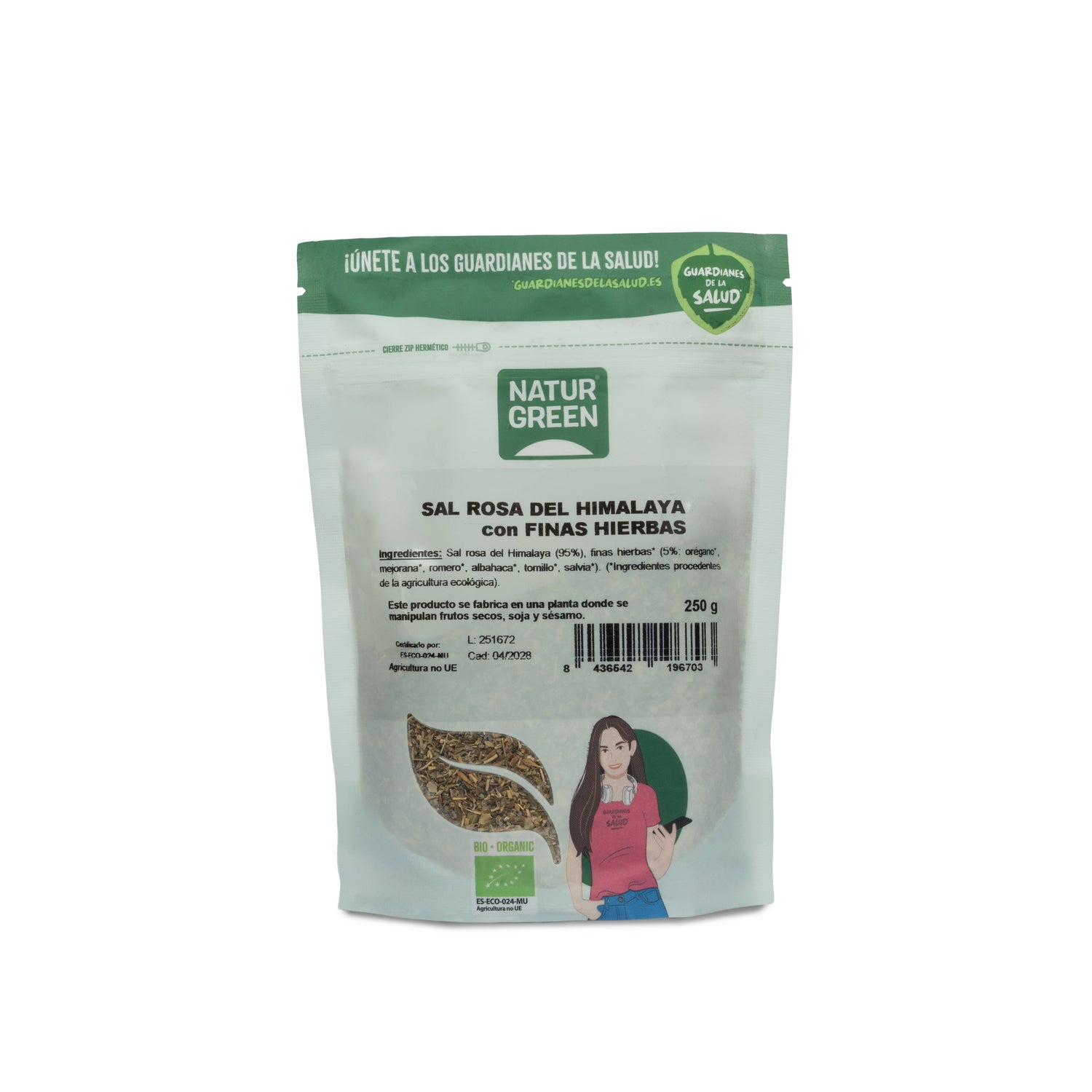 Sel rose de l'Himalaya aux fines herbes d'origine biologique avec certificat vert qui garantit qu'il s'agit d'un produit qui a été élaboré avec des produits issus de l'agriculture biologique, en respectant l'environnement. Ce produit convient aux régimes végétariens et végétaliens et est sans gluten.