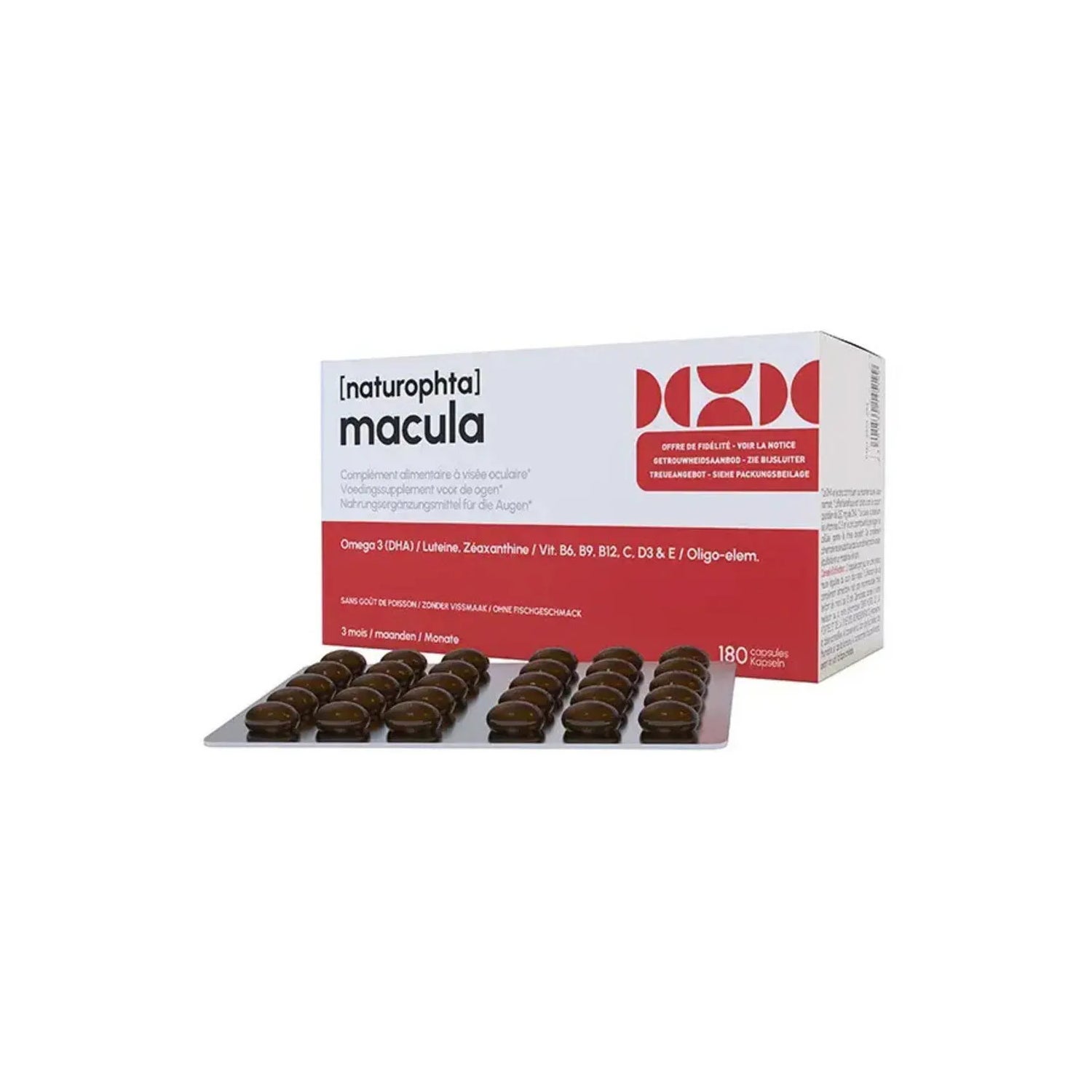 Naturophta Macula 180 Capsules est un complément alimentaire à visée oculaire composé d’un complexe de vitamines B, C, E, de caroténoïdes, de zinc et riche en Oméga 3 contenu dans l’huile de poisson.