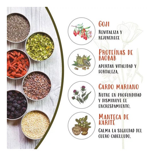Masque capillaire à base de baies de goji, un super aliment aux propriétés anti-âge grâce à sa forte capacité antioxydante. Aide à réparer, protéger, hydrater et adoucir les cheveux, leur donnant un aspect revitalisé.