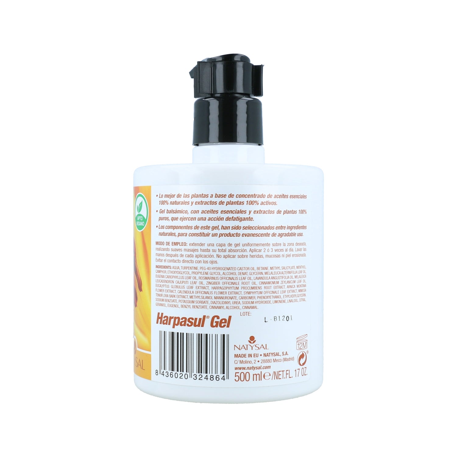 Le Gel Natysal Harpasul® au Silicium organique 500 ml est un gel balsamique à effet froid-chaud contenant de l'harpagofito, de l'arnica et du silicium organiques, ainsi que des huiles essentielles et des extraits de plantes 100 % purs. Pour l'appliquer, étaler une couche uniforme sur la zone souhaitée et masser doucement jusqu'à absorption complète, en répétant l'opération 2 ou 3 fois par jour. Tenir hors de portée des enfants et conserver dans un endroit frais et sec. Parmi ses ingrédients remarquables, citons l'extrait d'eucalyptus, l'harpagofito, l'arnica, la consoude, le calendula, le tepescohuite, le camphre, le menthol et les huiles essentielles de térébenthine, de cannelle, d'arbre à thé, de clou de girofle, de romarin, de lavande, de cajeput et de gingembre, ainsi que le silicium.