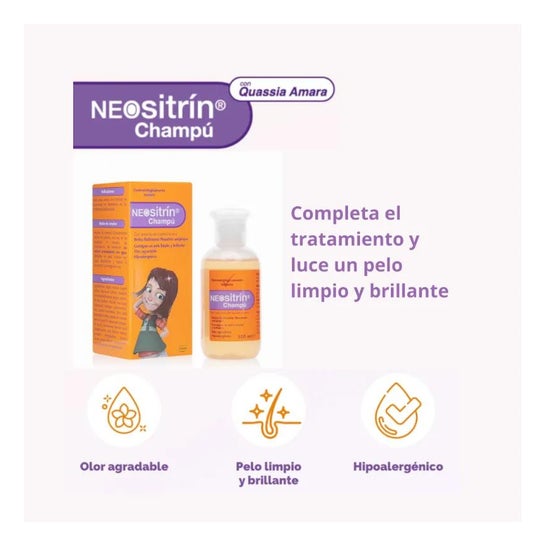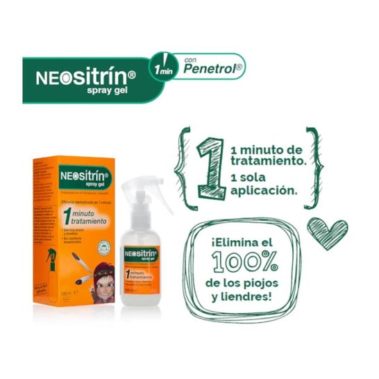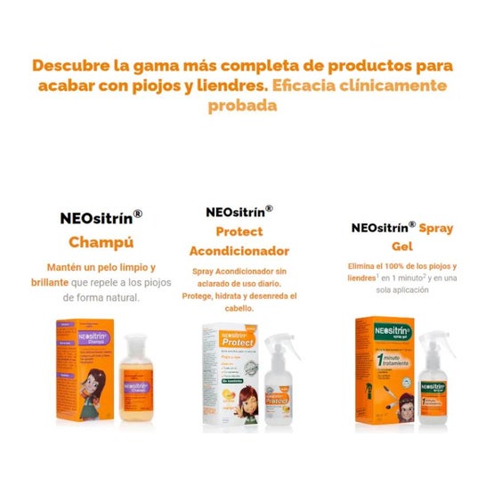 Appliquer Neositrin Spray Gel uniformément sur les cheveux secs à une distance de 10 cm. S'assurer de couvrir tout le cuir chevelu, des racines aux pointes. Frotter doucement et laisser agir seulement 1 minute. Sans rincer au préalable, appliquer du shampooing et masser les cheveux. Rincer abondamment à l'eau et répéter le lavage avec du shampooing. Appliquer l'après-shampooing sur les cheveux humides et démêler avec un peigne ou un peigne à lentes. Peigner soigneusement pour retirer les lentes mortes et laisser sécher les cheveux de manière habituelle.
