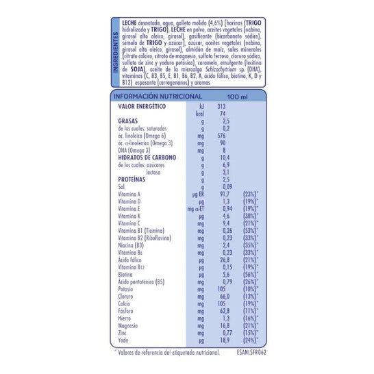 Lait écrémé, eau, biscuits moulus (blé et farines de blé hydrolysées, huiles végétales, caramel naturel, lait écrémé et sel), sucre, huiles végétales.Amidon de maïs, hextrinomaltose, sels minéraux, lécithine de soja, vitamine, bicarbonate de sodium, arômes caramel, vanilline