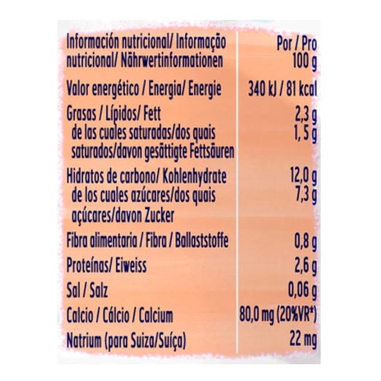 Lait fermenté (82,5%), eau, sucre, amidon de tapioca, ferments lactiques (contenant du lait), épaississant (pectine), protéines de lait, arôme naturel (avec lactose). Amidon de maïs modifié, pectine, citrate de magnésium, sels minéraux concentrés du lait et sulfate de zinc.