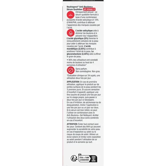 Si le sérum est bien toléré, il peut être utilisé avec le Gel Nettoyant Anti-grains+ de Neutrogena pour renforcer les résultats, bien qu'il soit recommandé d'interrompre son utilisation combinée en cas de malaise.