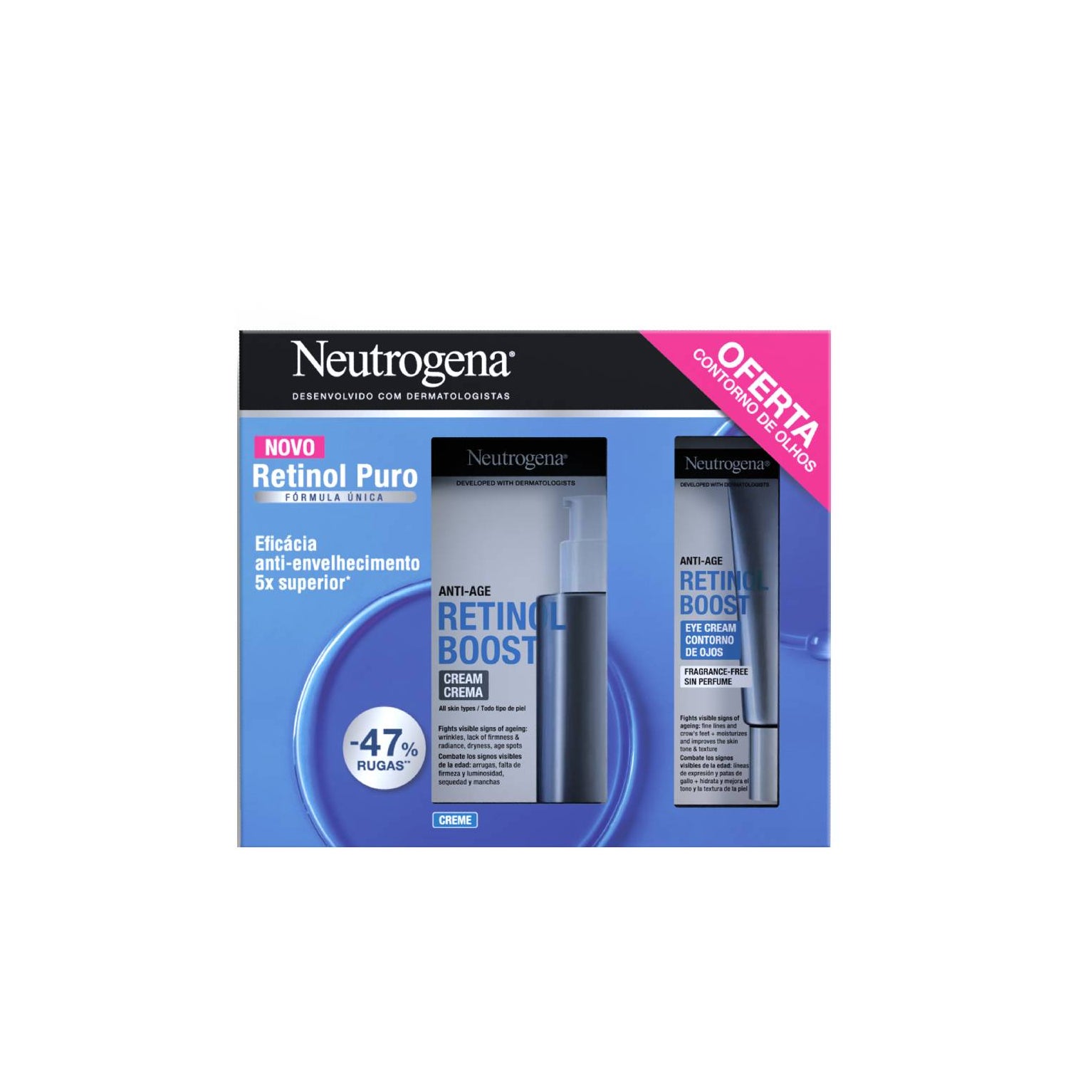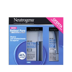 Pack Neutrogena Retinol Boost de Crème anti-âge et Contour des yeux - Pour une peau plus jeune et saine Transforme l'apparence de ton regard et de ta peau avec ce pack Neutrogena Retinol Boost. La formule de la Crème hydratante anti-âge avec rétinol, extrait de feuille de myrte et acide hyaluronique apporte une dose de rétinol pur à la surface de la peau et combat les signes visibles de l'âge, tels que les rides, la diminution de la fermeté, la peau fatiguée, la sécheresse ou les taches de pigmentation. La formule avancée du Contour des yeux, enrichie en rétinol pur, est conçue pour combattre les signes visibles du vieillissement, réduisant les rides d'expression et les pattes d'oie, tout en améliorant la luminosité et en unifiant le teint de la délicate zone du contour des yeux. Grâce à sa combinaison d'ingrédients efficaces, comme le rétinol pur, qui stimule la production de collagène et la régénération cellulaire, aidant à combattre les rides et l'aspect terne ; l'extrait de myrte, qui renforce l'efficacité du rétinol grâce à ses propriétés régénératrices ; et l'acide hyaluronique, qui hydrate et raffermit la peau, le contour des yeux et la crème pour le visage offrent à la peau un aspect sain et radieux. Leurs formules uniques sont si efficaces que 100 % des personnes ayant essayé cette routine ont remarqué une amélioration visible en une semaine*. Avantages du produit : Routine de crème anti-âge et contour des yeux Combat les signes de l'âge Améliore la texture et l'apparence de la peau Hydrate Avec rétinol pur, acide hyaluronique et extrait de myrte Format : contour des yeux (1 x 15 ml), crème anti-âge (1 x 50 ml) *Testé cliniquement sur 36 femmes pendant 8 semaines, avec une utilisation quotidienne.