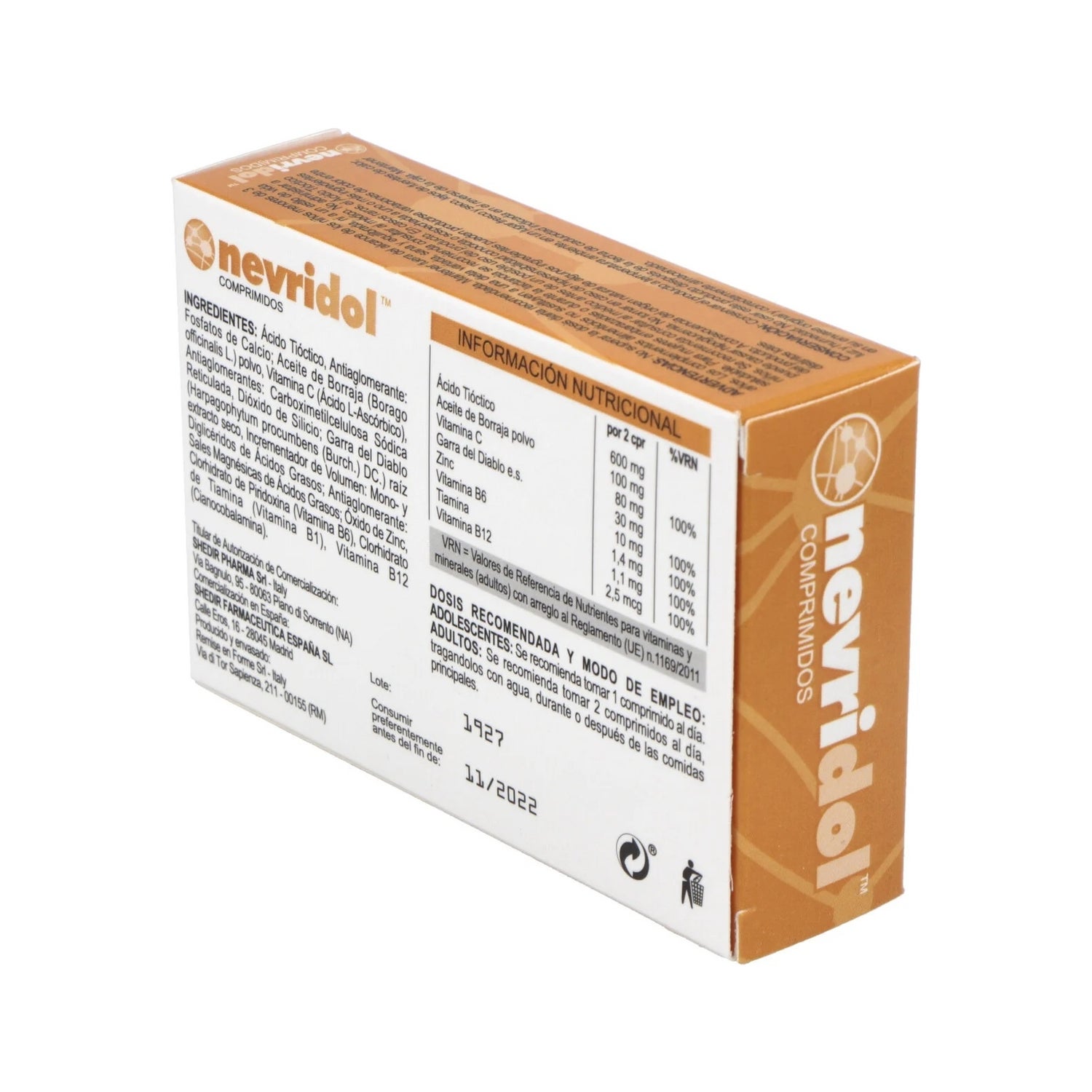 ACIDE THIOCTIQUE, ANTIAGGLOMÉRANT : PHOSPHATE DE CALCIUM DIBASIQUE ANHYDRE, 40% HUILE DE BORAGO OFFICINALIS L (BOURRACHE) EN POUDRE DONT 7% D'ACIDE GAMMA LINOLÉNIQUE, VITAMINE C (ACIDE ASCORBIQUE L), ANTIAGGLOMÉRANT : CARBOXYMÉTHYLCELLULOSE SODIQUE RÉTICULÉE, SILICE AMORPHE, EXTRAIT SEC DE RACINE D'HARPAGOPHYTUM PROCUMBENS DC. (GRIFFE DU DIABLE) DONT 1,5% D'HARPAGOSIDES. (GRIFFE DU DIABLE) DONT 1,5% D'HARPAGOSIDES. AUGMENTATEUR DE VOLUME : GLYCÉROL BENHATE. ANTI-AGGLOMÉRANT : STÉARATE DE MAGNÉSIUM VÉGÉTAL, OXYDE DE ZINC, VITAMINE B6 (CHLORHYDRATE DE PYRIDOXINE), VITAMINE B1 (CHLORHYDRATE DE THIAMINE), VITAMINE B12 (CYANOCOBALAMINE). PAR DEUX COMOPRIMIDES : ACIDE THIOTIQUE 600 mg, HUILE DE BORAGE 40% EN POUDRE 100 mg, VITAMINE C 80 mg, HARPAGOSIDES 1,5% E.S. de DEVIL'S CLAW 30 mg, ZINC 10 mg, VITAMINE B6 1,4 mg, VITAMINE B1 1,1 mg, VITAMINE B12 2,5 mcg.
