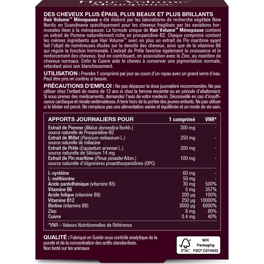New Nordic Hair Volume Menopausa est un complément alimentaire conçu spécifiquement pour aider les femmes pendant la phase de la ménopause, une période caractérisée par des changements hormonaux qui peuvent affecter la santé des cheveux. Ce produit contribue à limiter la chute des cheveux associée à ces changements, en régulant l'activité hormonale et en stimulant la microcirculation du cuir chevelu.