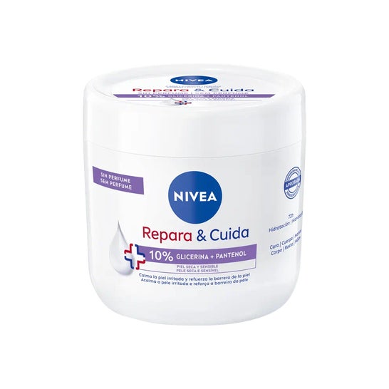 Nivea Répare & Prend Soin 10% Glycérine + Panthénol 400 ml est une crème conçue pour offrir un soin intensif à la peau sèche et sensible. Sa formule, qui contient 10% de glycérine et de panthénol, est spécialement conçue pour :