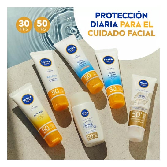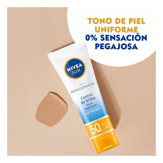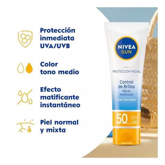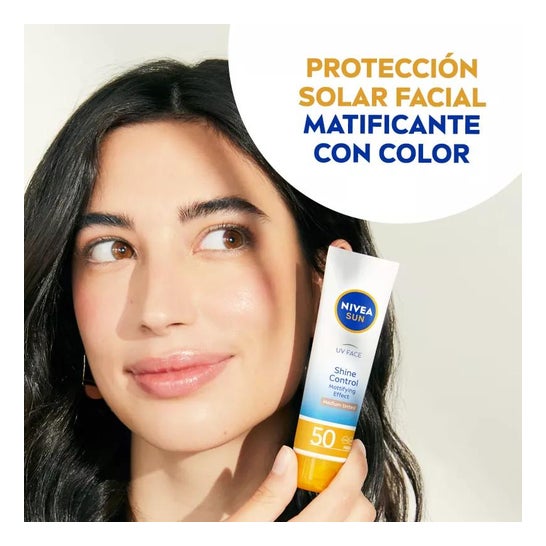Nivea Sun Facial Sun Cream Shine Control SPF50 40ml est une crème solaire pour le visage qui aide à protéger la peau de l'action des rayons UVA/UVB et des effets de la lumière visible de haute énergie (HEVL), grâce à ses filtres SPF50 photostables. Elle convient aux peaux normales à sèches grâce à sa formule hydratante qui contient des pigments de couleur qui aident à unifier le teint du visage. Contient 40ml.