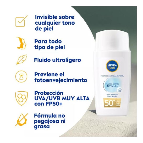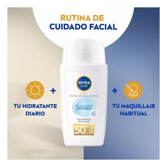 Nivea Sun Fluide Invisible Quotidien Spf50 40ml est un fluide facial conçu pour un usage quotidien. Sa texture ultra-légère offre un fini invisible, permettant une application confortable et discrète.