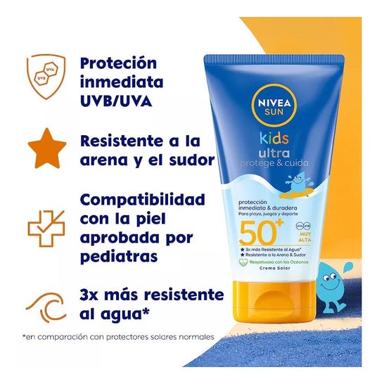 Crème pour le corps enrichie d'un écran solaire à large spectre SPF50. Aide à protéger la peau des plus jeunes membres de la famille des effets nocifs des rayons du soleil pendant les journées à la plage ou les activités de plein air. Sa formule résiste à l'eau, à la sueur et au sable. Convient aux enfants.