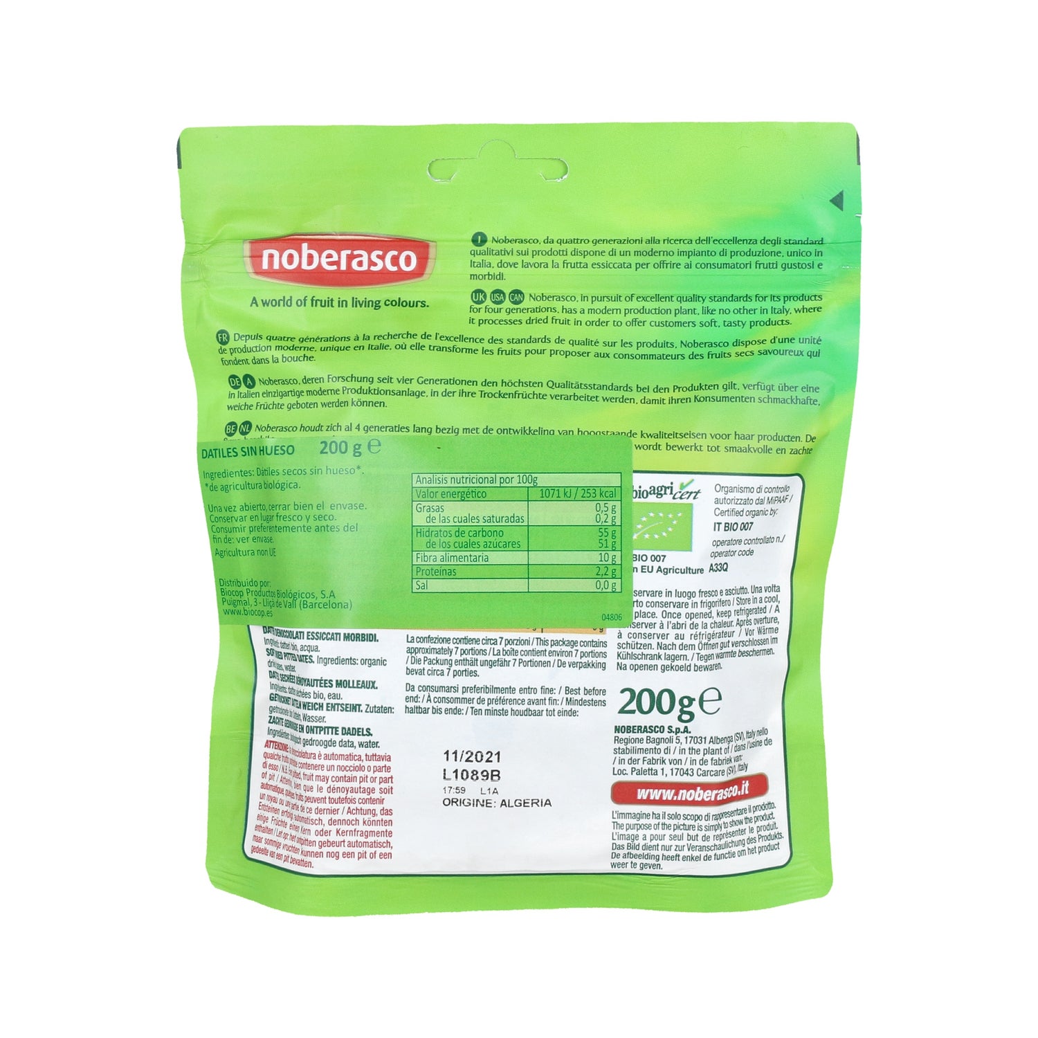 Dattes moelleux, séchés et dénoyautés, issus de l'agriculture biologique, avec une texture carnée et douce qui les rend idéaux pour la préparation de différents types de plats ou de pâtisseries.