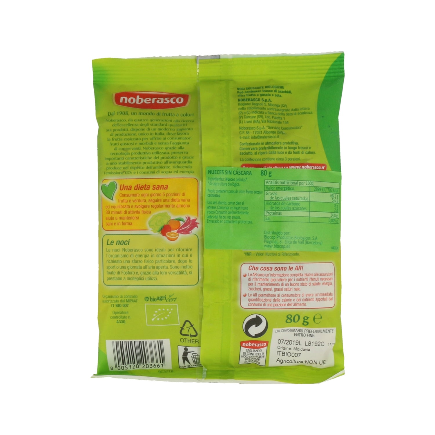 Noberasco Shelled Walnuts 80g un produit alimentaire à base de noix décortiquées. un parfait en-cas sain et plein de propriétés, tant organoleptiques que saines. très adapté pour fournir des acides gras végétaux. sa haute teneur en vitamines omégas 3 et 6 et en vitamine e en fait une source de santé. recommandé dans les processus de changement d'habitudes saines.