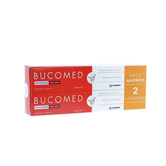 Normon Bucomed Pack Pâte Anticaries 2x125 ml comprend deux tubes de dentifrice anticaries de 125 ml chacun, avec saveur de menthe rafraîchissante. Il est indiqué pour la prophylaxie de la carie dentaire et pour l'hygiène bucco-dentaire quotidienne chez les adultes et les enfants à partir de 6 ans.