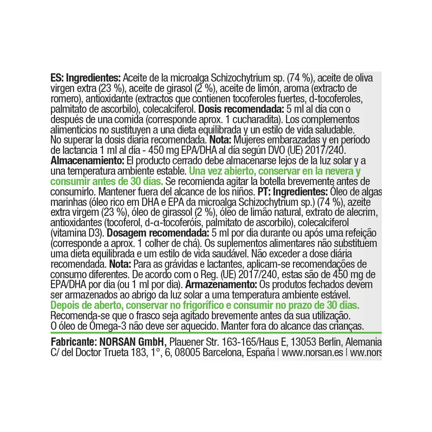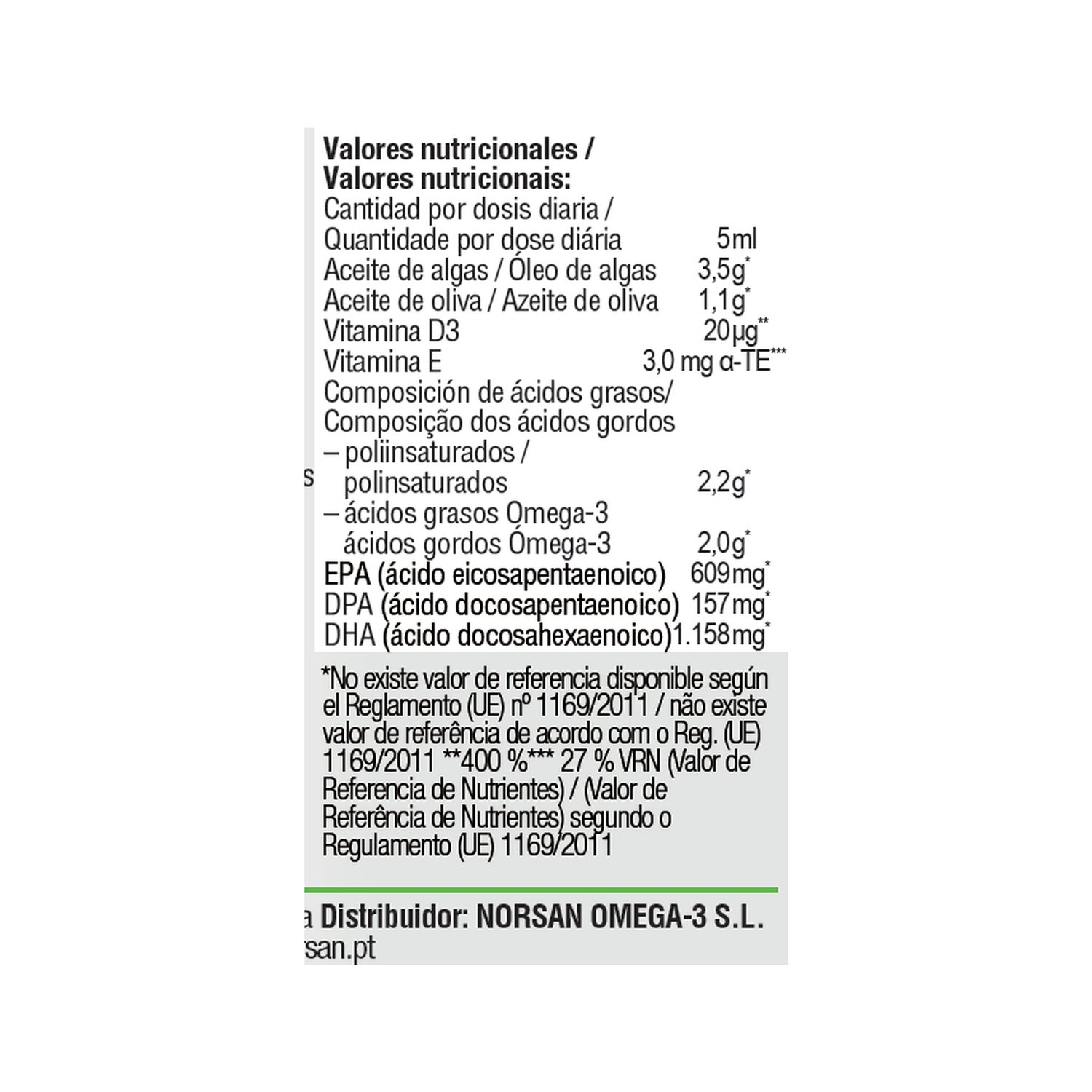 Huile d’algue (huile extraite de la microalgue Schizochytrium sp. à teneur élevée en DHA et EPA) (74%), huile d’olive (23%), huile de tournesol (2%), arôme naturel de citron, arôme naturel de romarin, antioxydants (d-α-tocophérols et tocophérols mixtes, palmitate d’ascorbyle), cholécalciférol (vitamine D3).