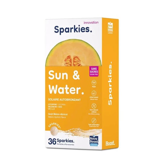Novaboost Sparkies Sun & Water 36comp est un complément alimentaire sous forme de micro-perles à base d'algues et de vitamines C et E qui aide à préparer la peau au bronzage et à la maintenir plus longtemps. Contient 36 comprimés. Goût de melon et d'abricot. Convient aux végétaliens.