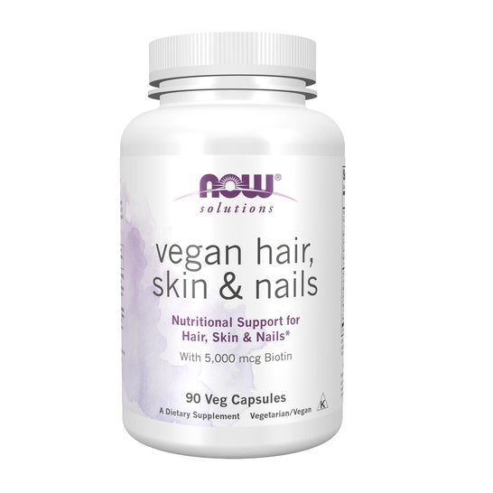 Now Vegan Hair Skin And Nails 90 capsules est un complément conçu pour promouvoir la santé et la vitalité des cheveux, des ongles et de la peau. Ce produit se concentre sur le bien-être du tissu conjonctif, qui joue un rôle fondamental en fournissant un soutien structurel à ces parties du corps.
