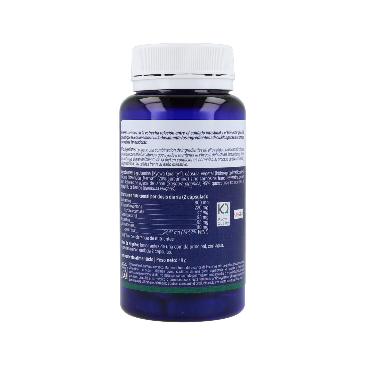 Ingrédients par dose (2 capsules) : L-Glutamine (Kyowa Quality) 800mg, gélule végétale (hypromellose), Curcuma liposomal (Meriva) 220mg, Zinc-Carnosine (Zinc) 112mg (fournit 24,06mg de zinc- 240,6% VNR), Acacia du Japon c.e. (30:1, 95% quercétine) 75mg, Polygonum Cuspidatum e.s. (98% resvératrol) 50mg, Polygonum Cuspidatum e.s. (25% resvératrol) 50mg et des agents anti-agglomérants (coques de riz moulues et mélange d'extraits de riz biologique). Sans lactose. Sans gluten. Sans sucre. Sans sel. Convient aux végétaliens.