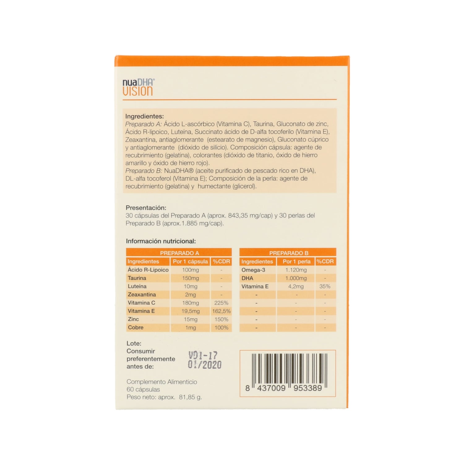 NuaDHA Vision 60 Capsules est un complément alimentaire contenant tous les nutriments essentiels pour aider à maintenir la vision en bon état grâce à ses effets sur la rétine, la cornée et le cristallin. En ajoutant également des vitamines et des antioxydants dans sa composition, il protège l'œil contre les dommages oxydatifs causés par le passage du temps et les effets néfastes de la lumière solaire et artificielle, prolongeant ainsi plus longtemps le bon état de la vision.