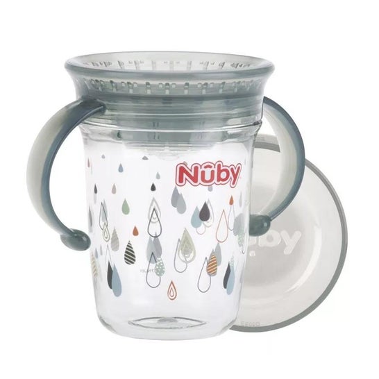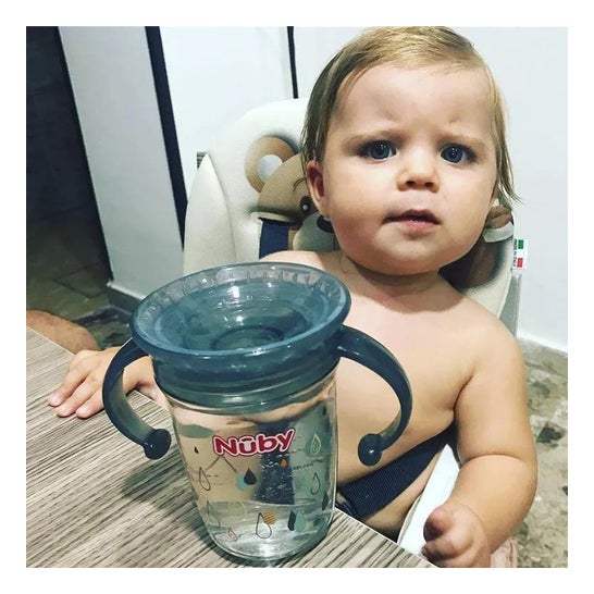Tasse d'apprentissage avec poignées et système anti-goutte. Il est fabriqué en Tritan™, un matériau breveté qui est résistant, transparent et élégant. De plus, il possède une valve en silicone qui permet de boire lorsqu'on appuie dessus. Spécialement conçu pour faciliter la transition entre la consommation d'une tasse et celle d'un verre.