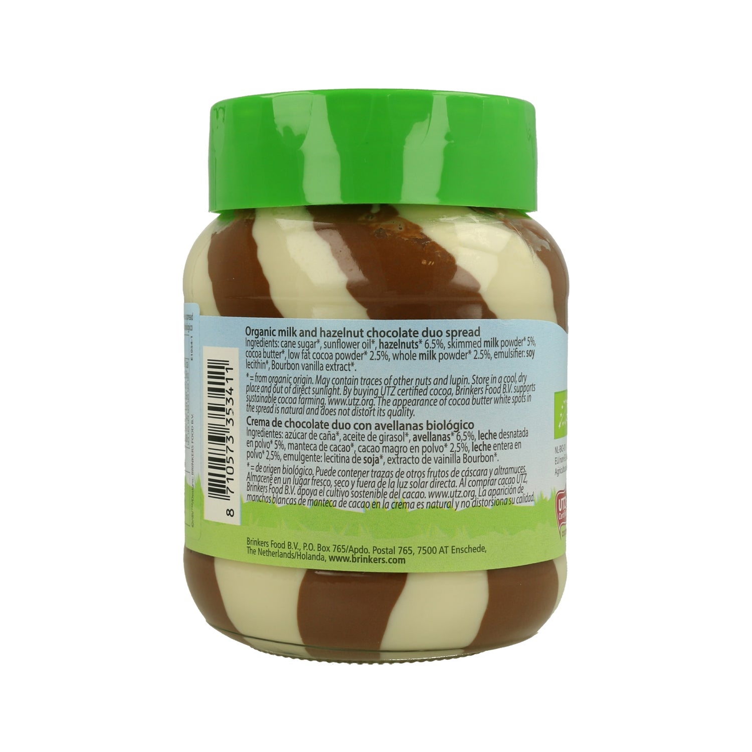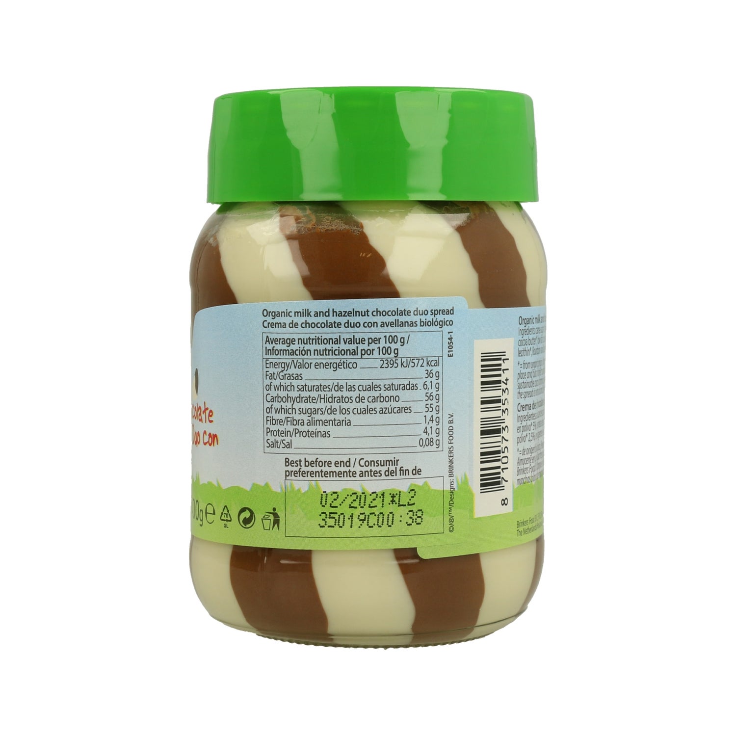 Crème dessert au chocolat Duo, fabriquée à partir de produits 100% biologiques, au goût délicieux et à la texture lisse et crémeuse. Il est fabriqué avec du cacao certifié UTZ, qui est synonyme d'agriculture durable et offre de meilleures opportunités pour l'agriculteur et la planète. Il est idéal pour tartiner le pain, les biscuits et pour réaliser des desserts.