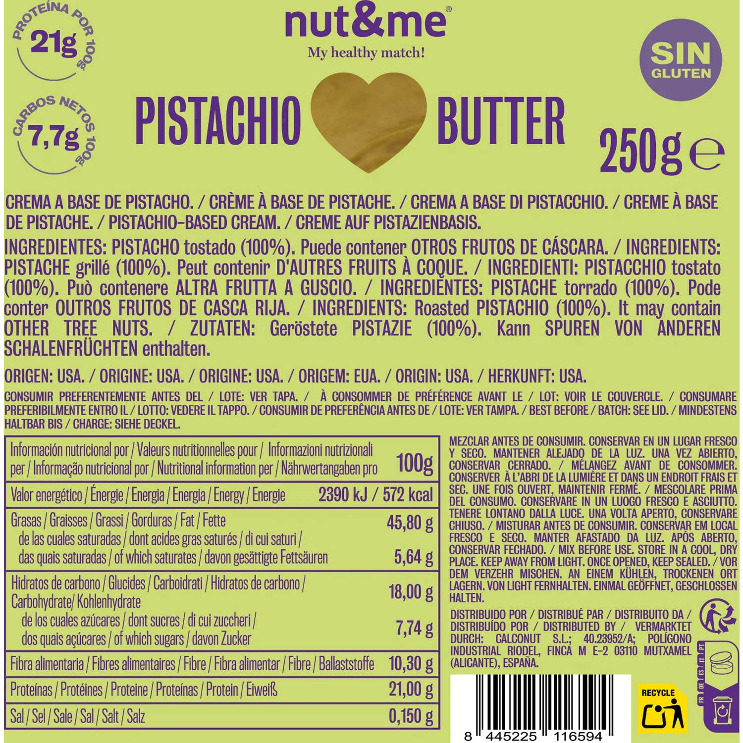 Nut&Me Crème Pistache 250g est une crème élaborée exclusivement avec des pistaches grillées, sans sel ni sucres ajoutés, et sans aucun type d'additif. Son goût est intense et équilibré, ce qui en fait une option idéale pour profiter :