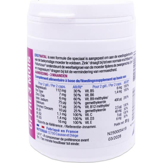 La formule d'Ergynatal a été optimisée avec l'inclusion de formes actives des vitamines B9 et B12 pour une meilleure absorption. Présenté dans une gélule végétale, ce produit est garanti sans colorants, conservateurs ni allergènes, ce qui le rend adapté à une alimentation végétarienne.