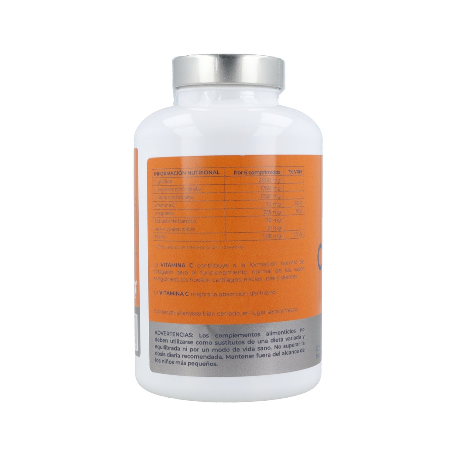 Complément alimentaire à base de vitamine C qui favorise la formation normale de collagène pour le fonctionnement régulier des vaisseaux sanguins, des os, des cartilages, des gencives, de la peau et des dents. Composé d'acides aminés, de vitamine C, de fer, de silicium et de magnésium.