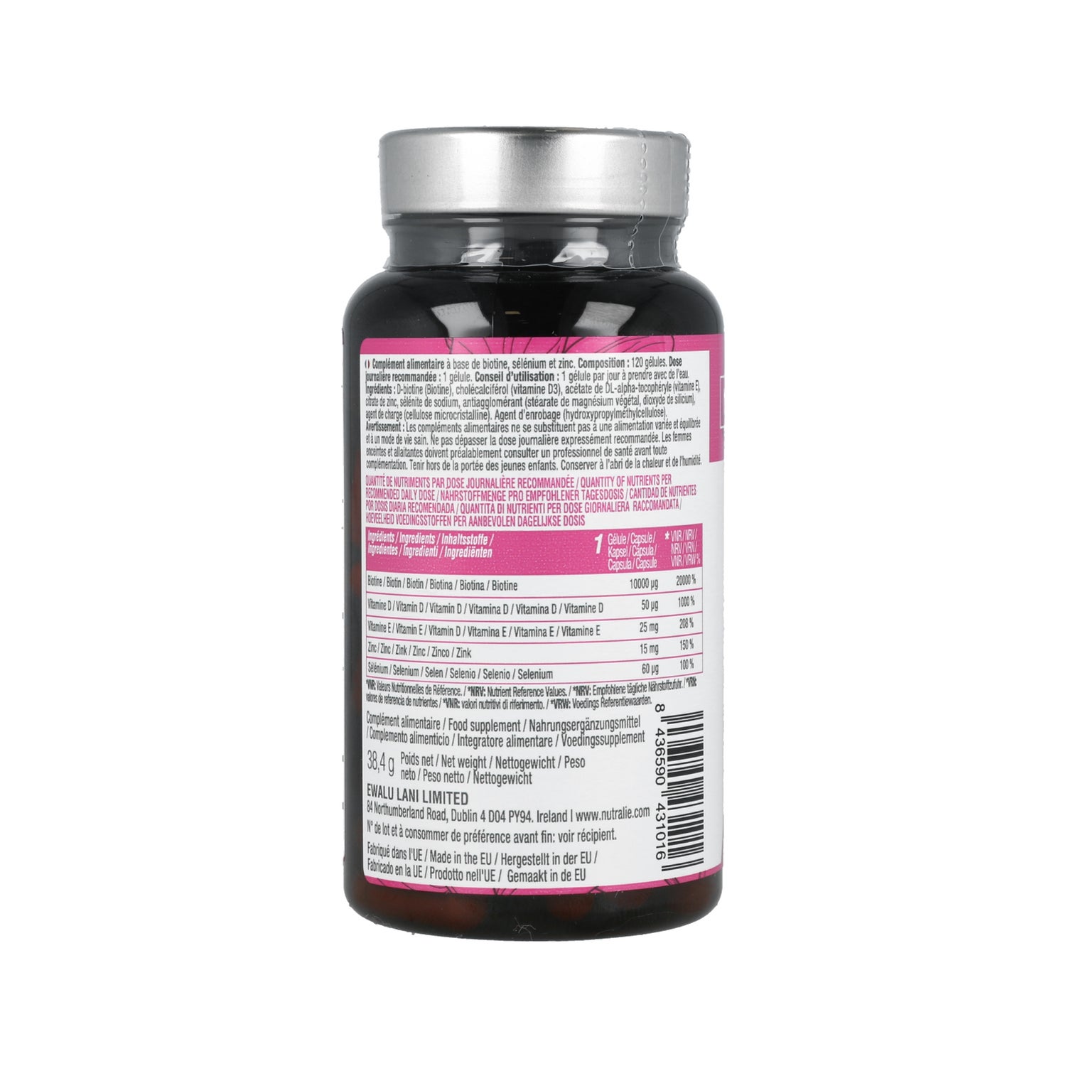 Nutralie Biotina Complex + Vit D et E 10000mcg Cheveux, Peau, Ongles 120caps est un complément alimentaire formulé avec de la vitamine D3, de la vitamine E, de la biotine et du zinc. Il aide à maintenir les cheveux et la peau en conditions normales grâce aux propriétés reminéralisantes et antioxydantes de ses ingrédients.