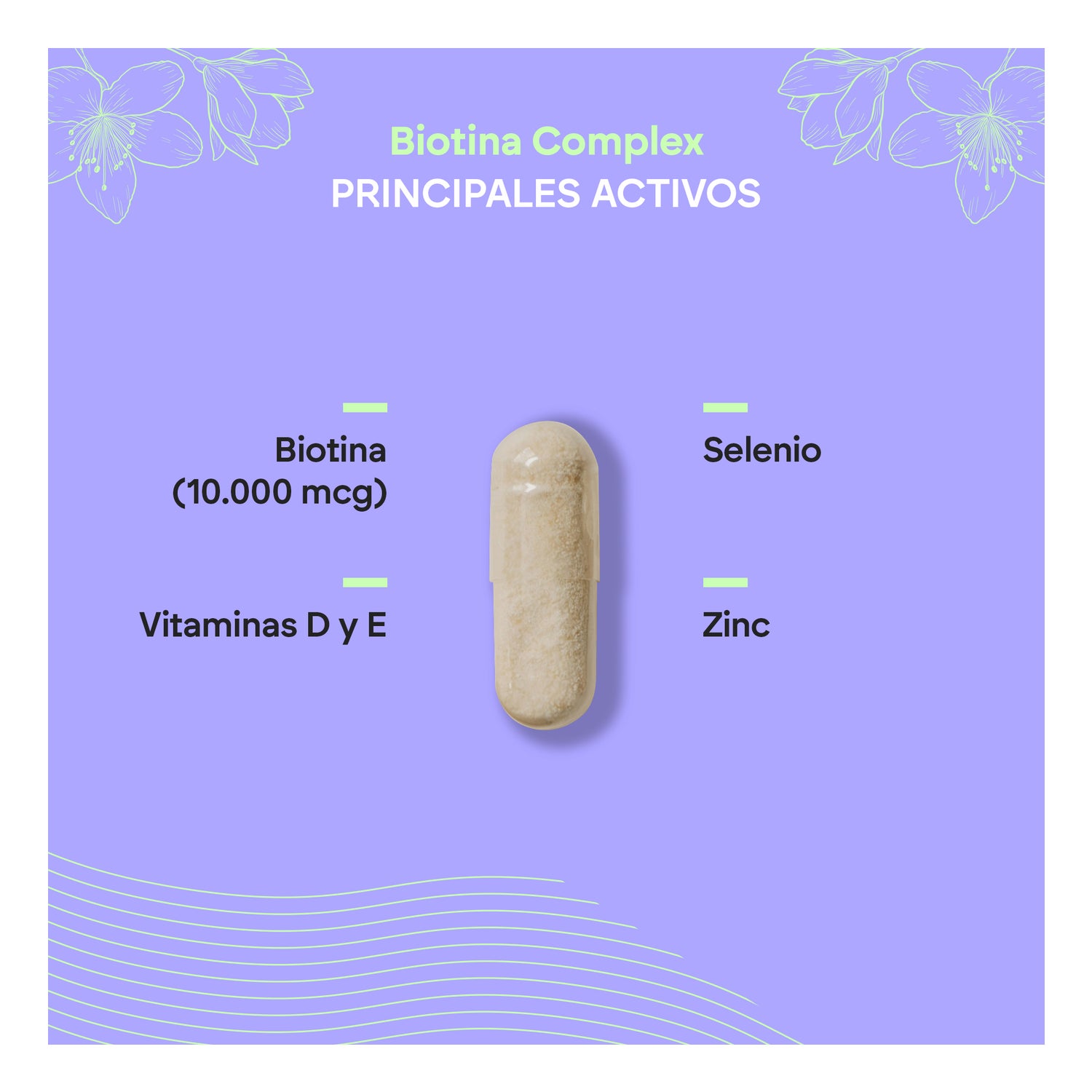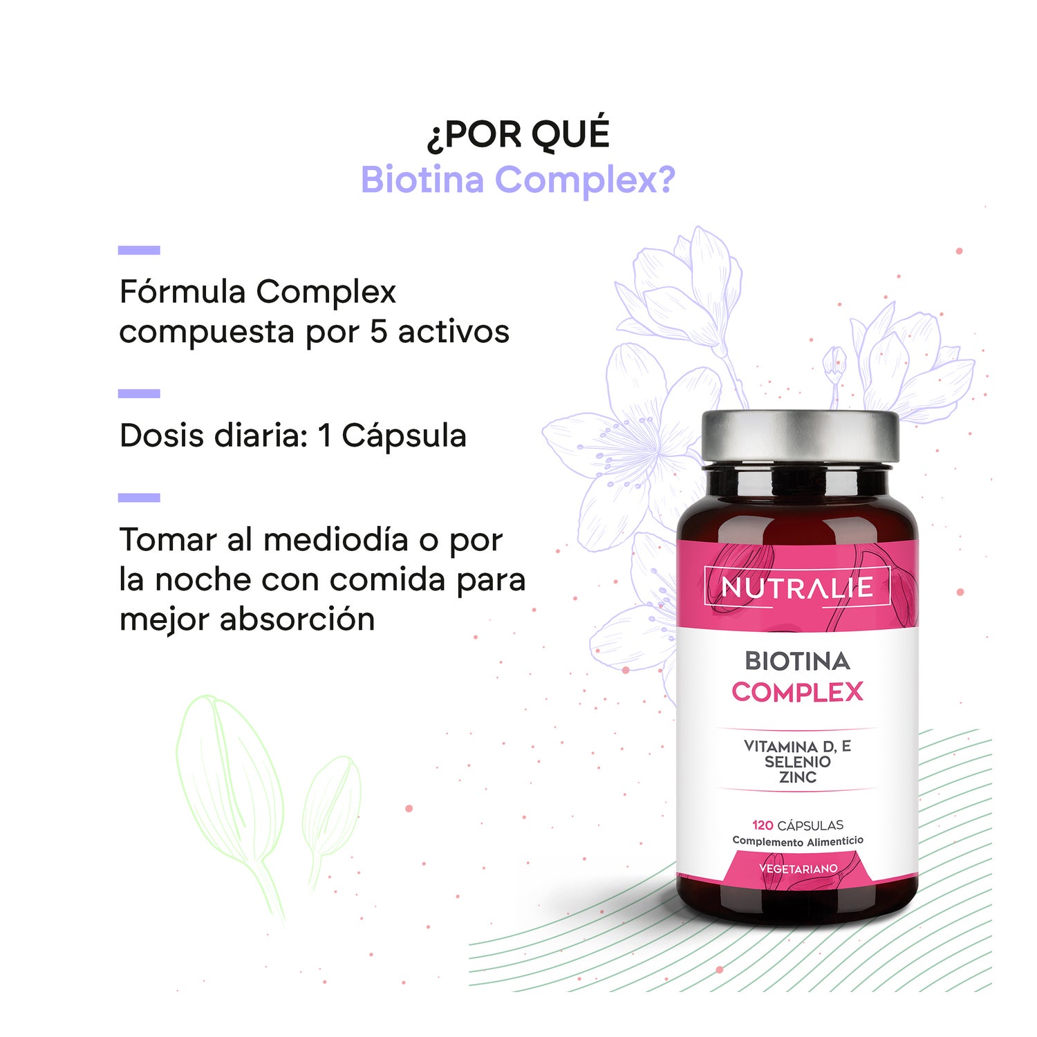 Nutralie Biotina Complex + Vit D et E 10000mcg Cheveux, Peau, Ongles 120caps est un complément alimentaire formulé avec de la vitamine D3, de la vitamine E, de la biotine et du zinc. Il aide à maintenir les cheveux et la peau en conditions normales grâce aux propriétés reminéralisantes et antioxydantes de ses ingrédients.