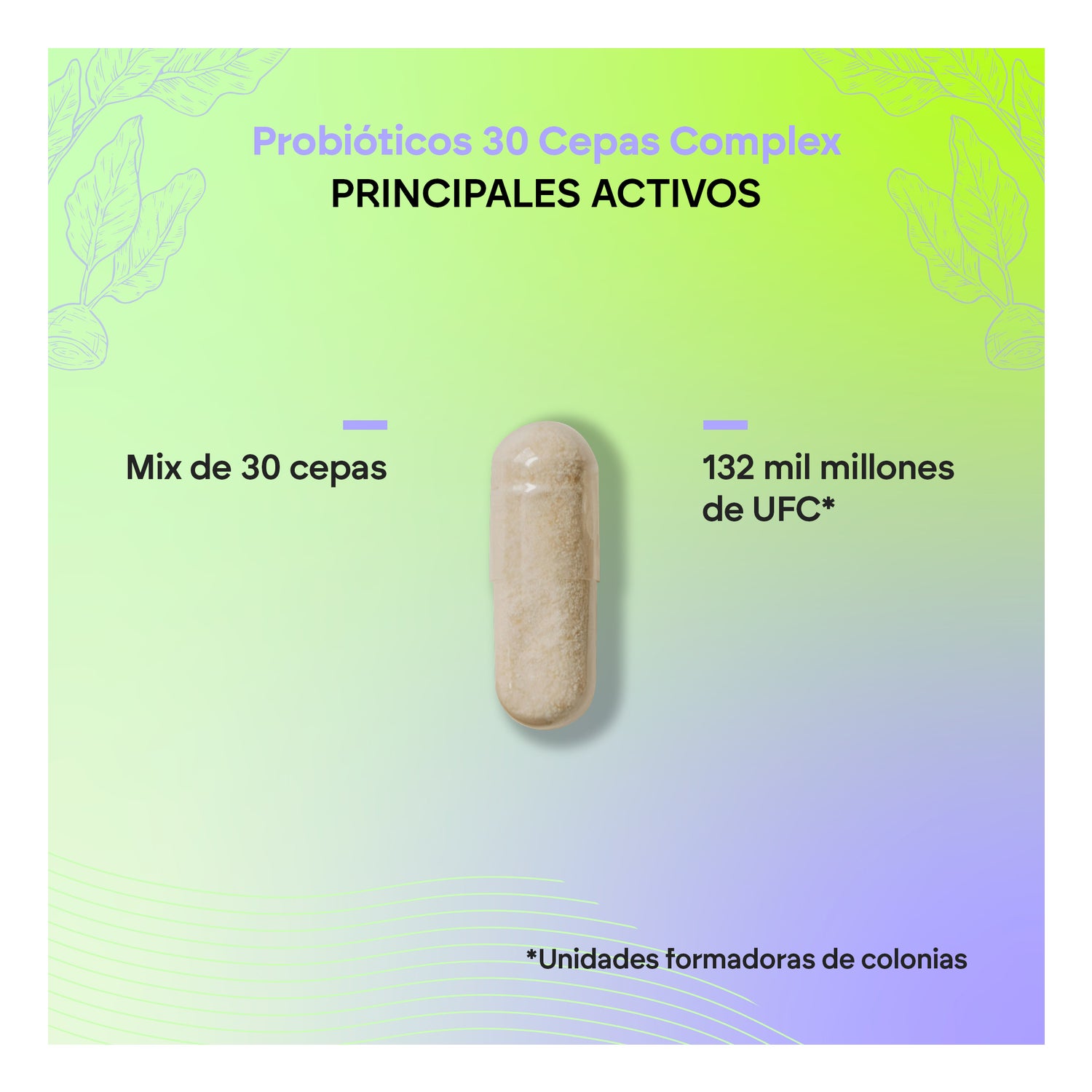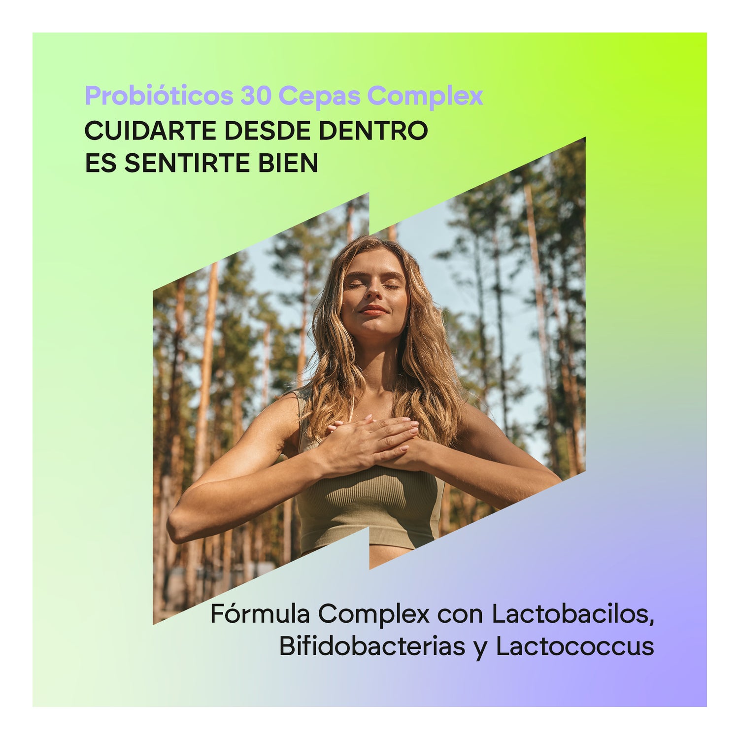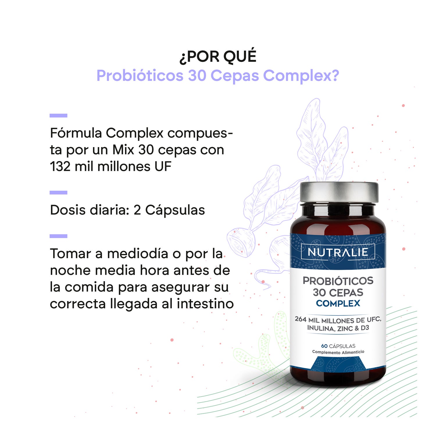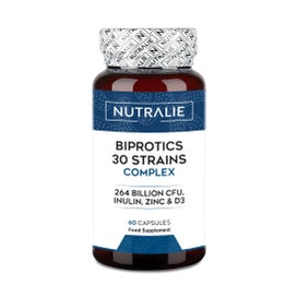 Mélange de 30 souches (Lactobacillus acidophilus, Lactobacillus reuteri, Lactobacillus rhamnosus GG, Lactobacillus rhamnosus, Lactobacillus salivarius, Lactobacillus brevis, Lactobacillus paracasei, Lactobacillus gasseri, Lactobacillus helveticus, Lactobacillus casei, Lactobacillus crispatus, Lactobacillus fermentum, Bifidobacterium infantis, Bifidobacterium bifidum, Bifidobacterium longum, Bifidobacterium lactis, Bifidobacterium breve, Pediococcus acidilactici, Streptococcus thermophilus, Lactobacillus lactis, Bifidobacterium animalis, Lactobacillus Johnsonii, Lactobacillus amylovorus, Lactobacillus sakei, Lactobacillus plantarum, Lactobacillus bulgaricus, Bifidobacterium adolescentis, Lactococcus lactis, Lactobacillus delbruekii, Leuconostoc mesenteroides) ; inuline, agent d'enrobage (hydroxypropylméthylcellulose), agent de charge (cellulose microcristalline), citrate de zinc, anti-agglomérants (stéarate de magnésium, dioxyde de silicium), gélifiant (gomme gellane), cholécalciférol (vitamine D).
