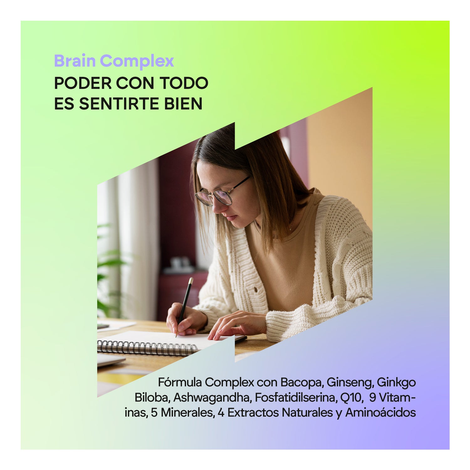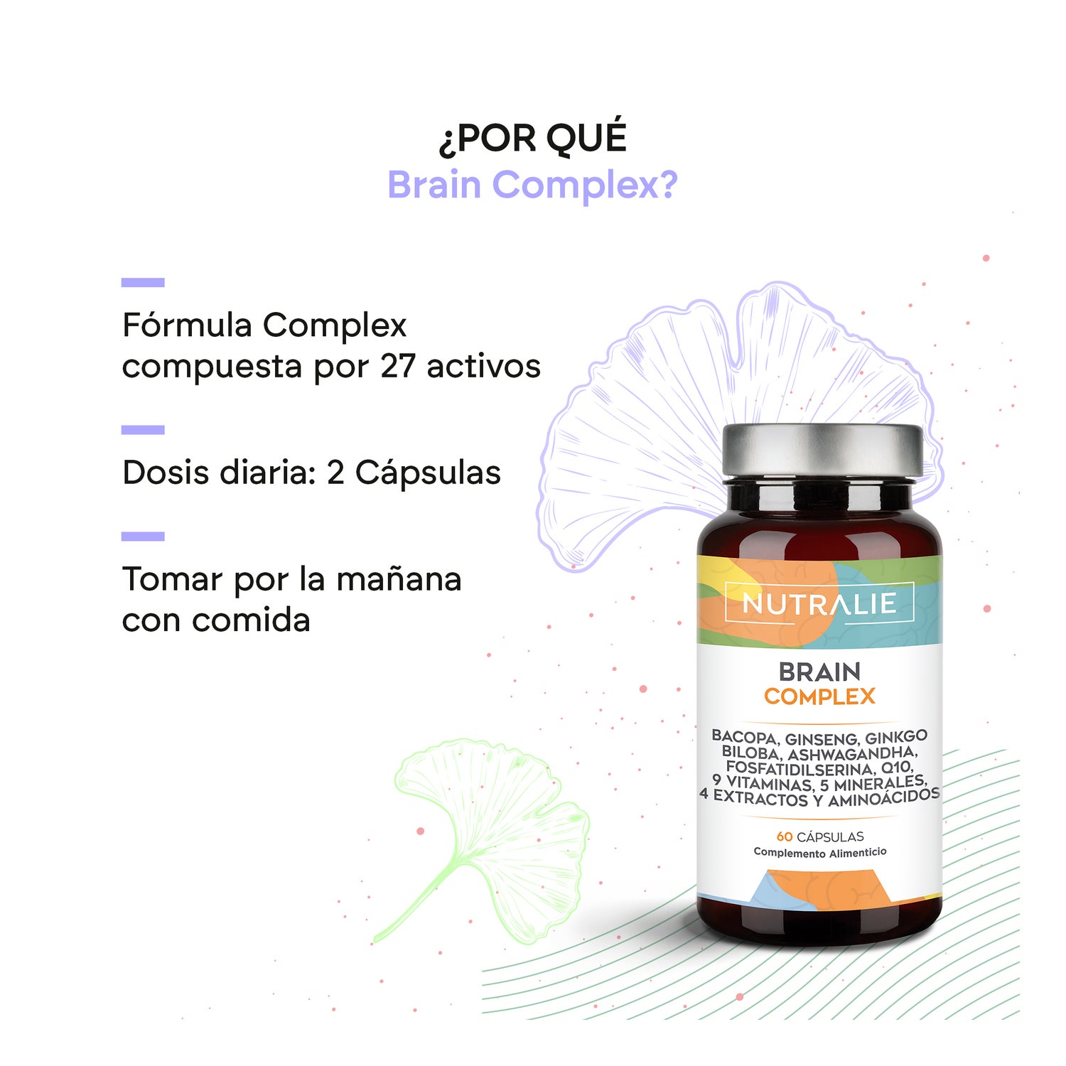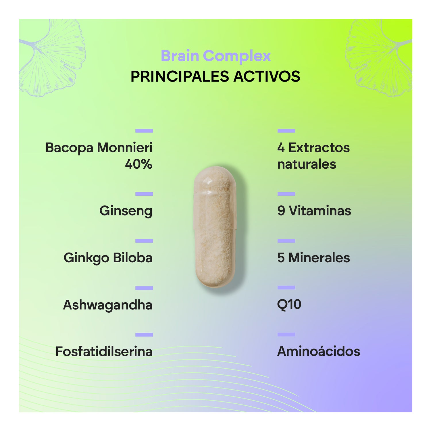 Sa formule contient des ingrédients tels que Ginseng, Ginkgo, Phosphatidylsérine, vitamines du groupe B pour combattre la fatigue et favoriser le bon fonctionnement du système nerveux, Coenzyme Q10 pour des performances optimales, Bacopa avec des propriétés neuroprotectrices en période de stress, et Ashwagandha qui apporte sérénité tant au cerveau qu'au corps.