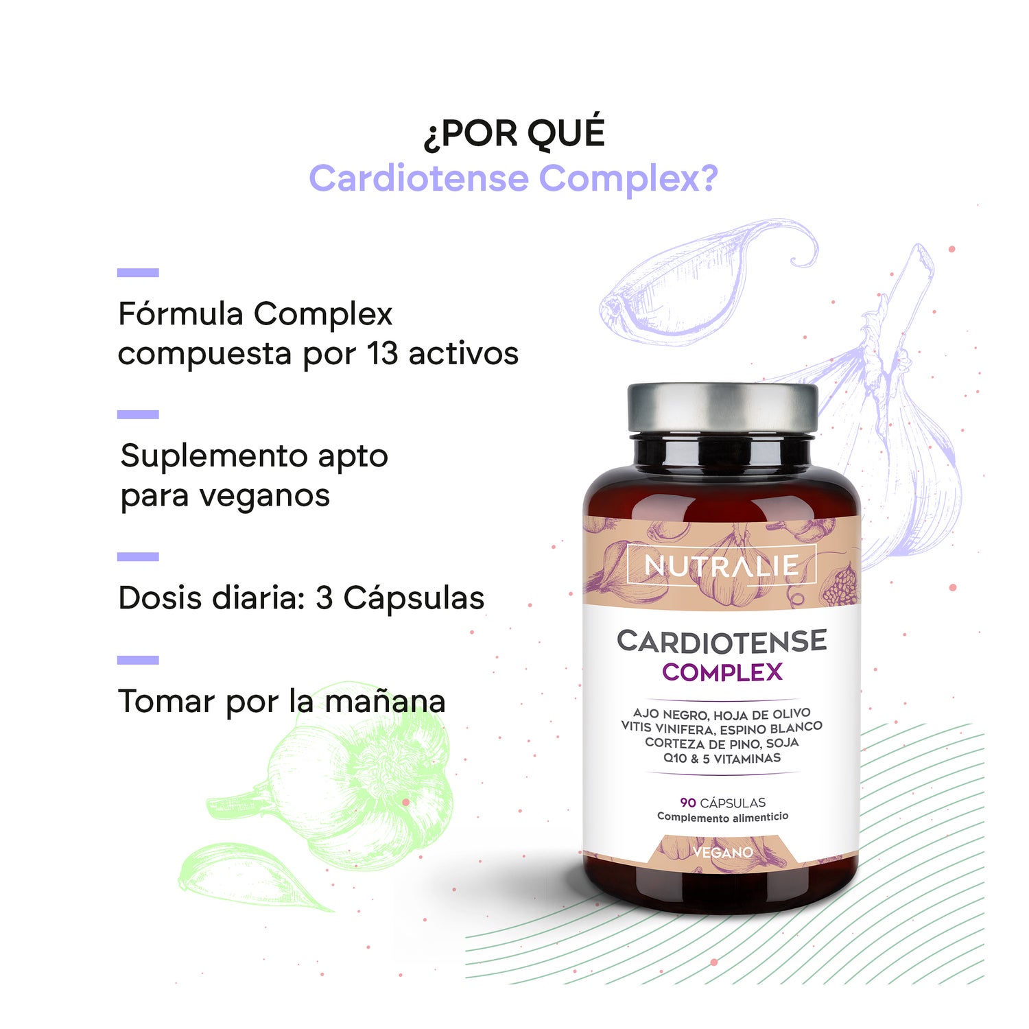 Cardiotense Complex de Nutralie est un complément alimentaire formulé avec 750 mg d'extrait pur d'Ail Noir (15:1) par dose, équivalent à 15 000 mg d'Ail Noir. Notre formule inclut les vitamines B6 et B12, qui contribuent à la formation normale des globules rouges, au métabolisme normal de l'homocystéine et, également, au fonctionnement normal du système immunitaire. D'autre part, la vitamine B2 contribue au maintien normal des globules rouges dans des conditions normales et contribue également à la protection des cellules contre les dommages oxydatifs.