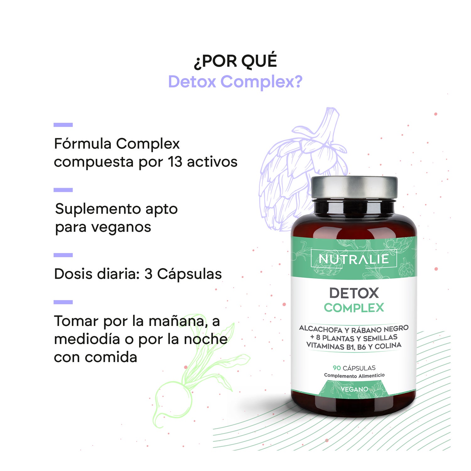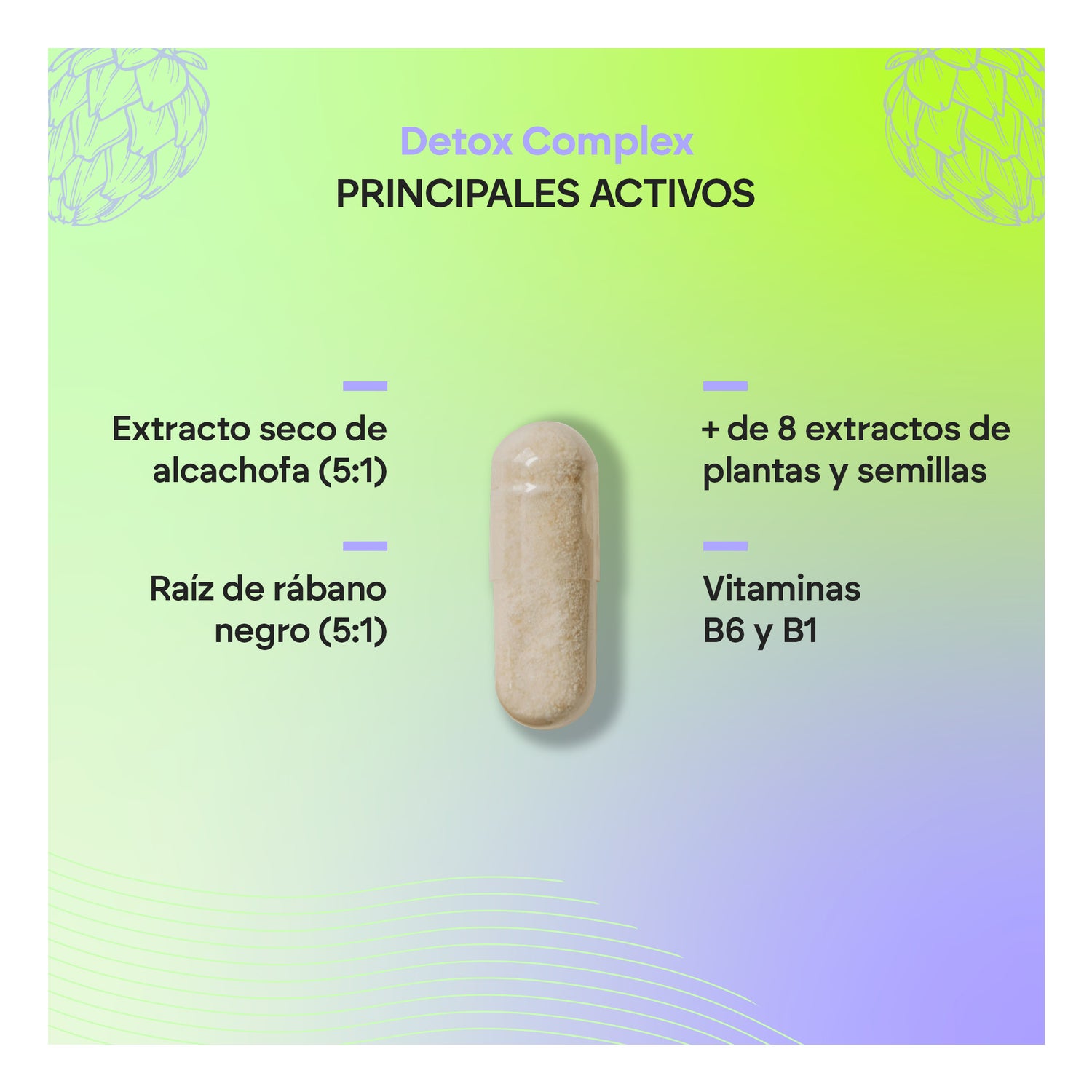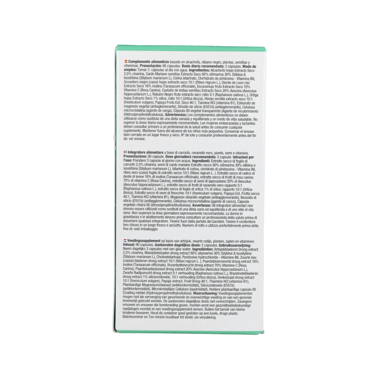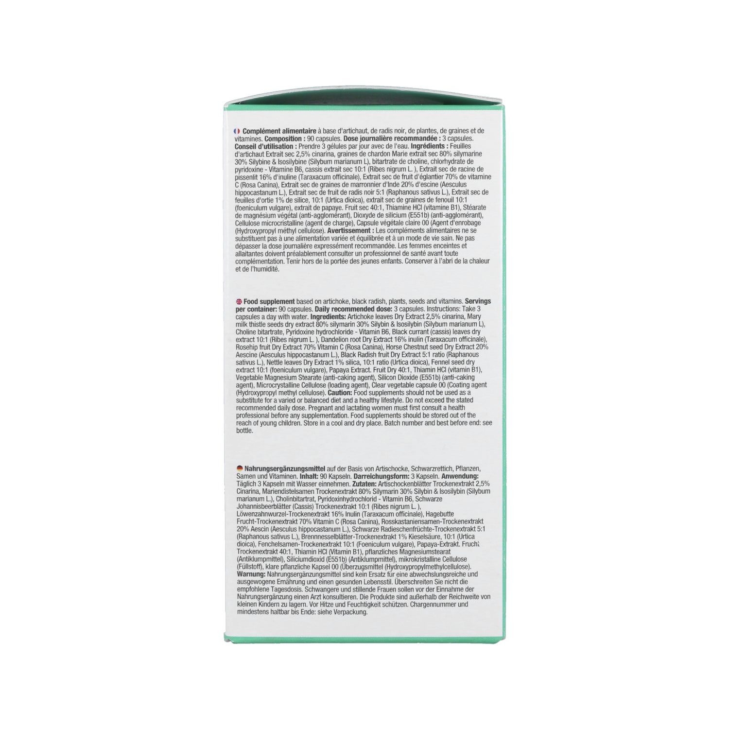 Extrait sec d'artichaut (Cynara scolymus L., feuilles), extrait sec de radis noir (Raphanus sativus L., racine), gélule : agent d'enrobage (hydroxypropylméthylcellulose), extrait sec de cassis (Ribes nigrum L., feuilles), agent de charge (cellulose microcristalline), extrait sec de pissenlit (Taraxacum officinale (L.) Weber ex F.H. Wigg., racine), extrait sec de cynorrhodon (Rosa canina L., fruit), extrait sec Chardon-Marie (Silybum marianum (L.) Gaertn., graine), extrait sec Marron d'Inde (Aesculus hippocastanum L., graine), extrait sec Ortie (Urtica dioica L., feuille), extrait sec Fenouil (Foeniculum vulgare Mill., graine), extrait sec Papaye (Carica papaya L., fruit), bitartrate de choline, anti-agglomérants (stéarate de magnésium et dioxyde de silicium), chlorhydrate de pyridoxine (vitamine B6), chlorhydrate de thiamine (vitamine B1).