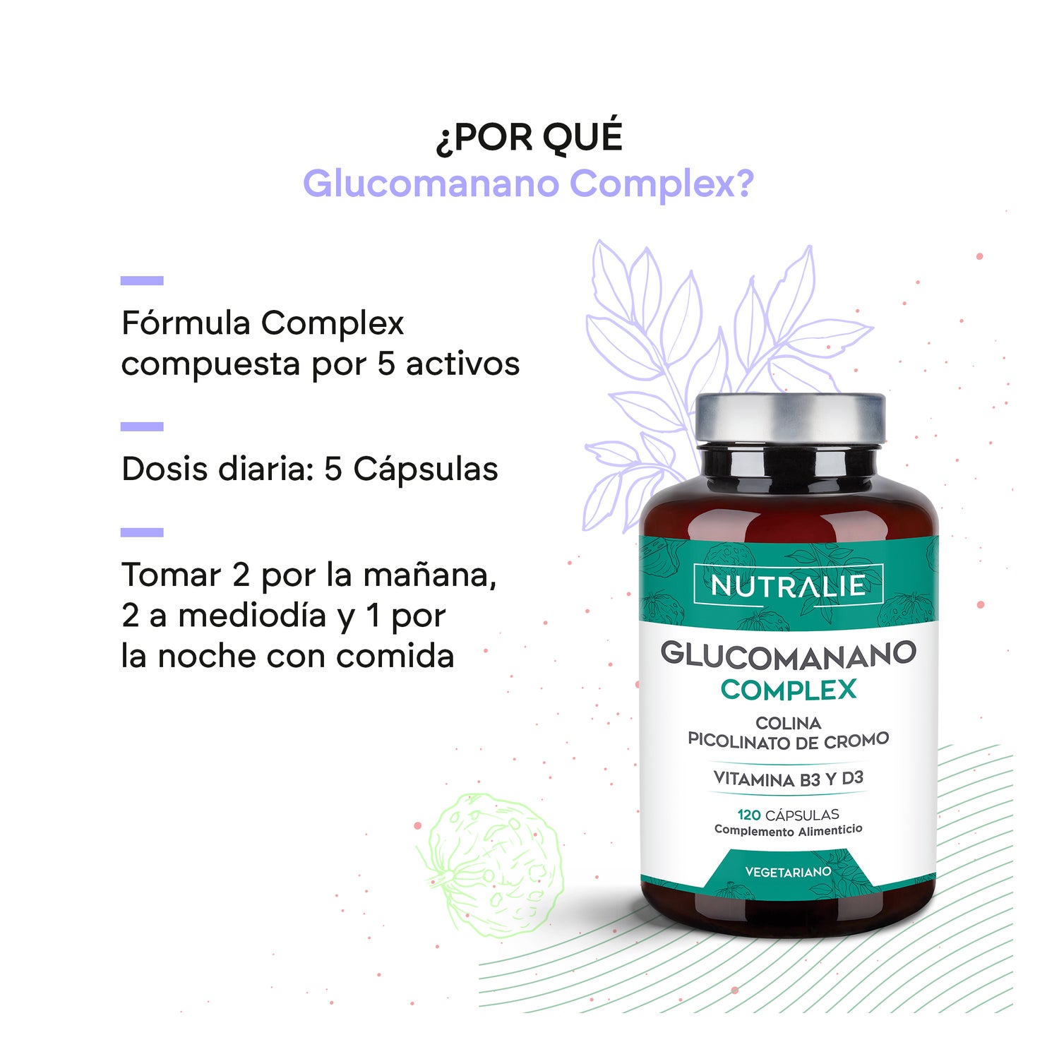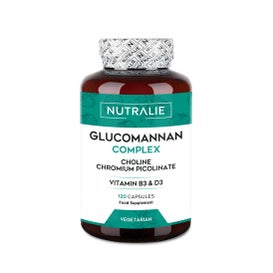 Nutralie Glucomannane + Choline + B3 + D3 Perte de Poids 120caps est un complément alimentaire entièrement naturel qui contient du Glucomannane, de la Choline, du Picolinate de Chrome et des Vitamines B3 et D3.
