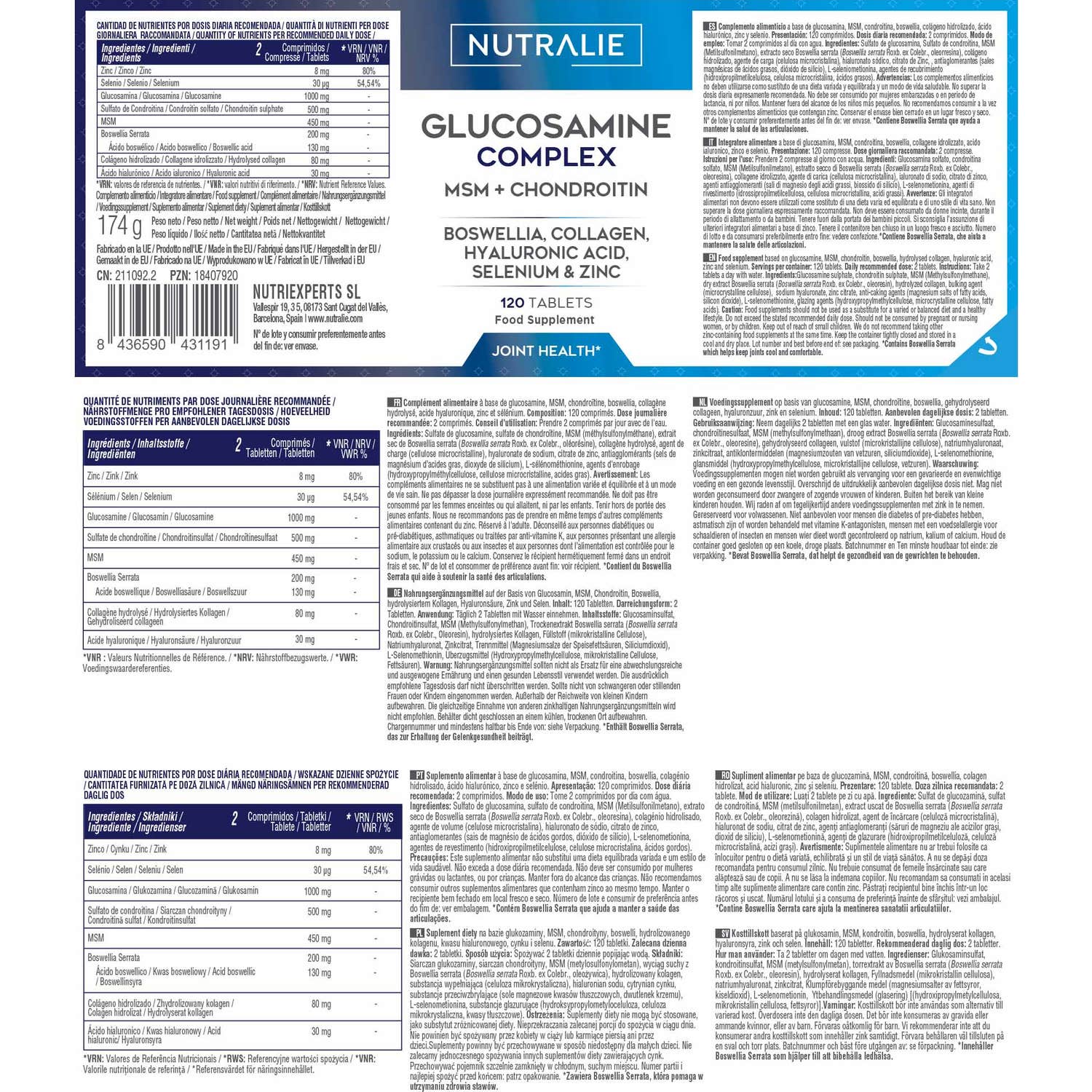 Nutralie Glucosamine Complex + MSM + Chondroitin 120comp est un complément alimentaire qui aide à prendre soin de la santé des articulations, formulé avec de l'acide hyaluronique, du collagène, de la chondroïtine et de la glucosamine.