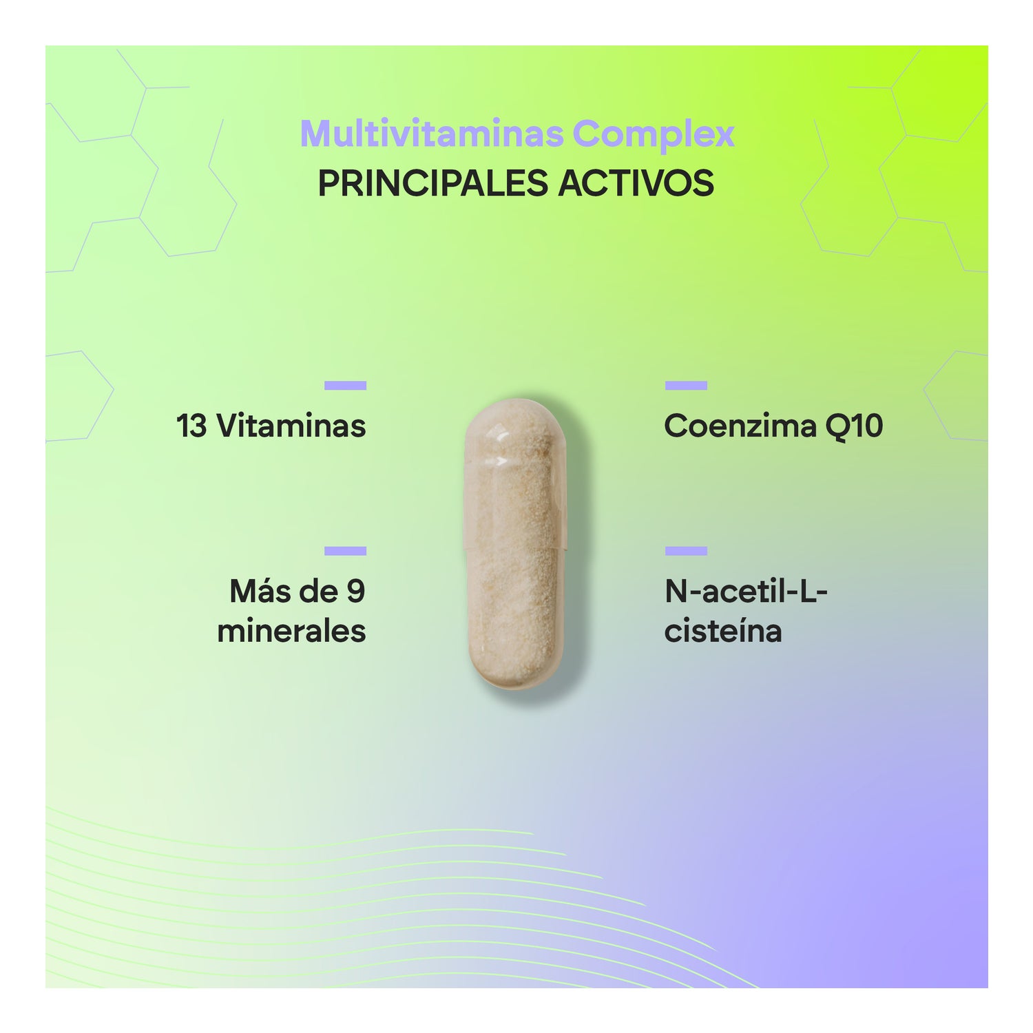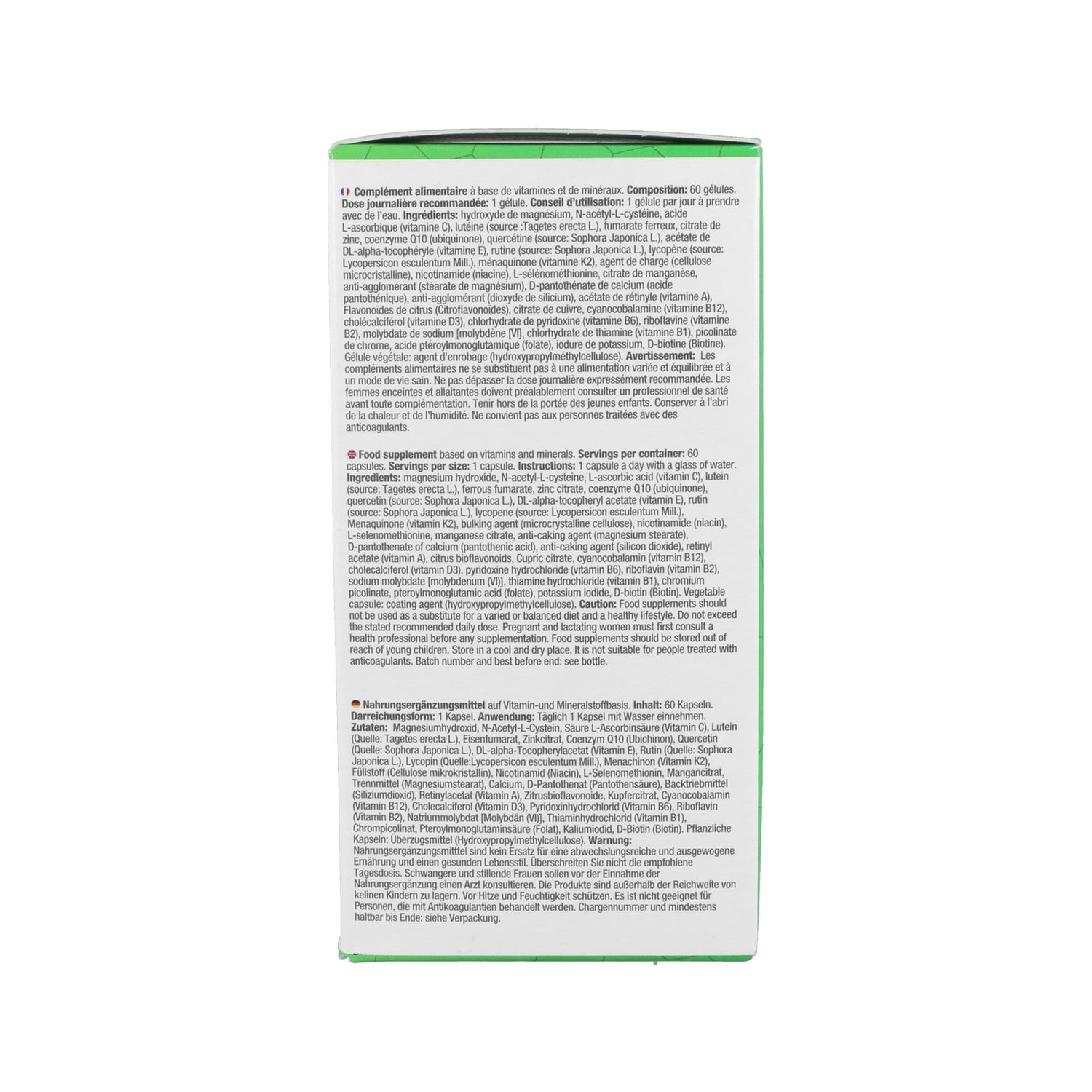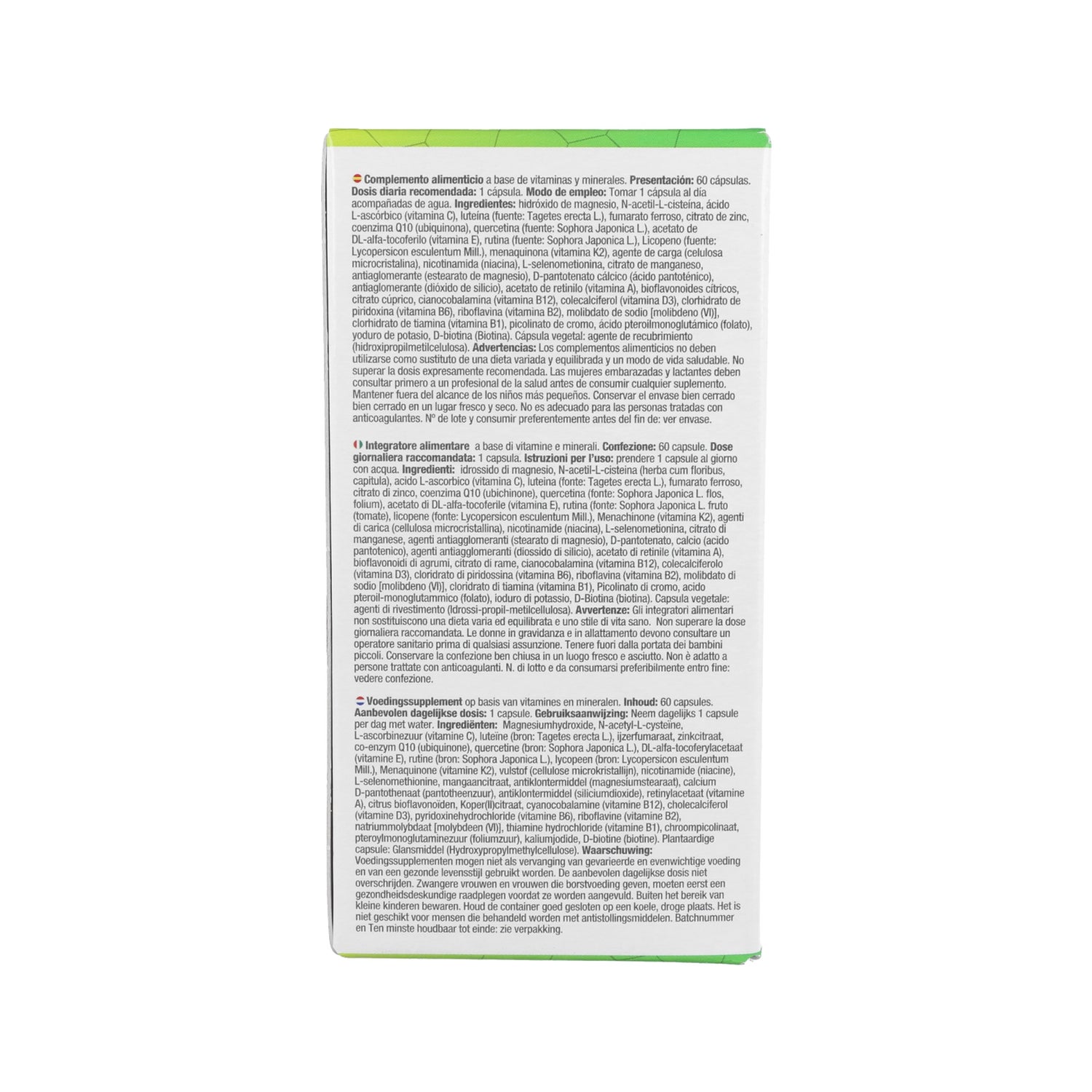 Hydroxyde de magnésium, N-acétyl-L-cystéine, acide L-ascorbique (vitamine C), lutéine (Source: Tagètes érigées L.), Fuma Fuma L.), acétate de DL-alfa-tocoferilo (vitamine E), Routine (source: Sophora Japanese L.), Licopeno (Source: Lycopersicon Esculentum Mill.), Menaquinone (vitamine K2), agent de charge (cellulose microcristalline), nicotinamide (niacine), L-selelétométine, citrate de manganèse, antiaglomérant (stéarate de magnésium)), citrate de manganèse, antiaglomère (stéarate de magnésium)), citrate de manganèse, antiaglomérant (Magnésium Stearate)) , D-calcium pacéthénate (acide pantoténique), anti-gomérant (dioxyde de silicium), acétate de rétinyle (vitamine A), cyanocoline bioflavonoïde cyclothique (vitamine B12), choléciferol (vitamine D3), pyridoxine bilon ), le molybdate de sodium [molybdène (VI)], le chlorhydrate de thiamine (vitamine B1), la picoline chromée (folate), l'iodure de potassium, la biotine D (biotine). Capsule végétale: agent de revêtement (hydroxipropilméthylcellulose).