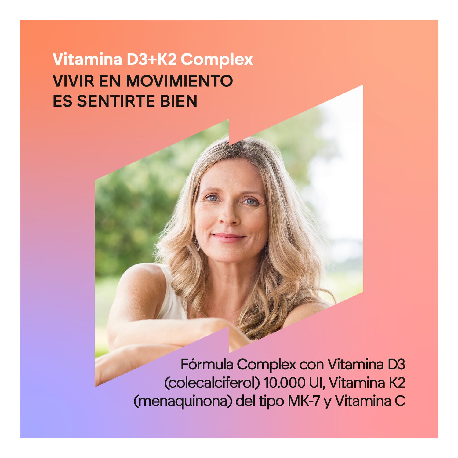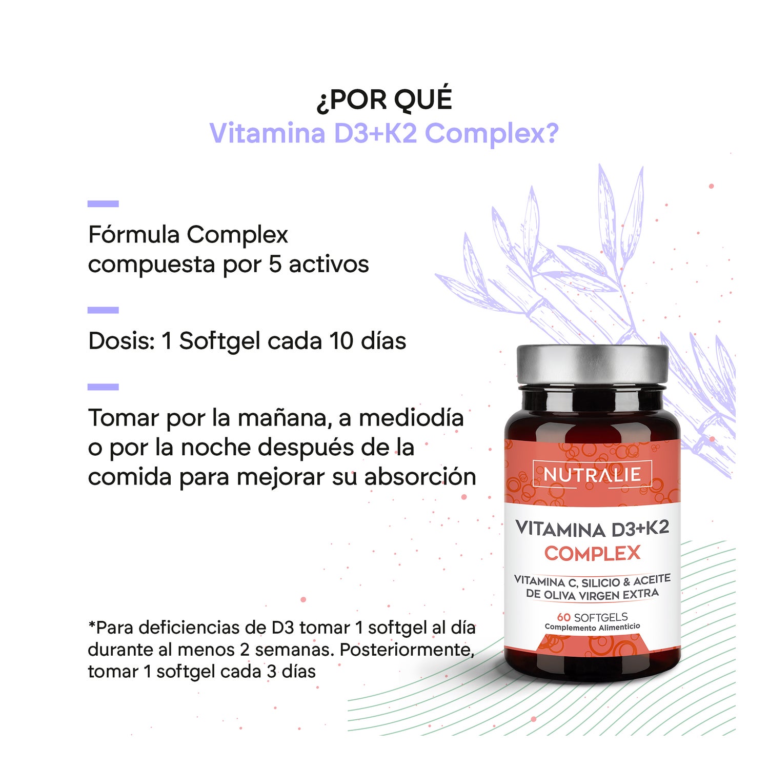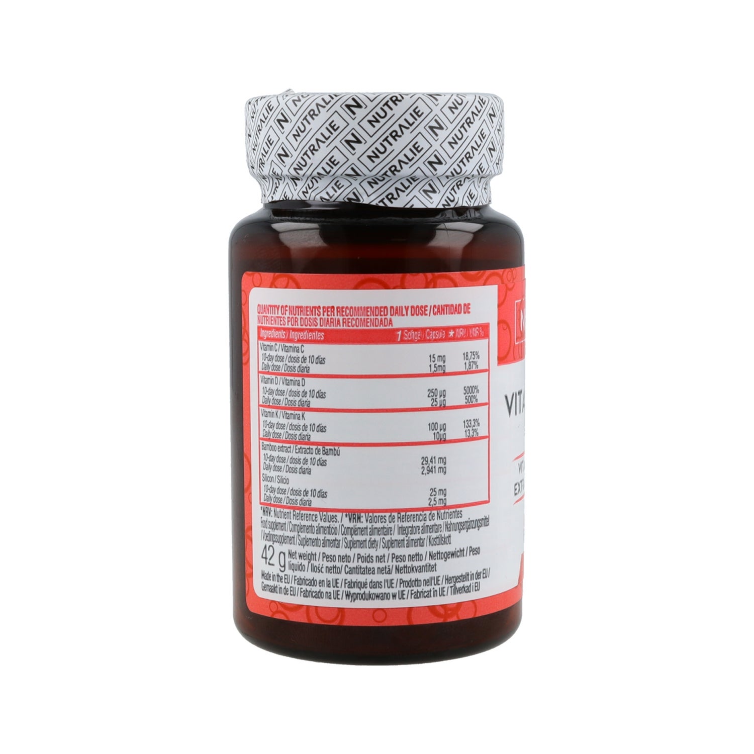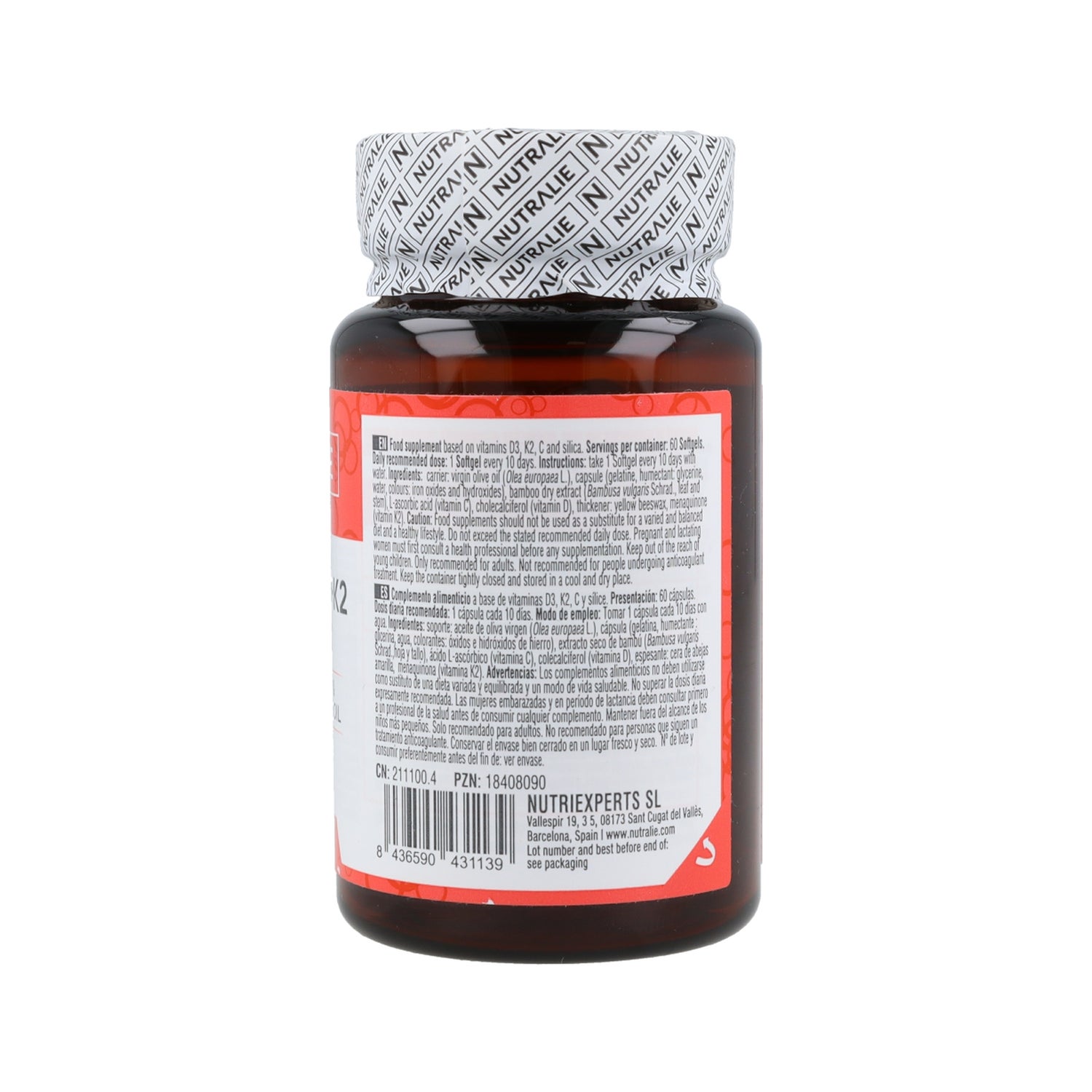 Nutralie Complexe Vitamine D3+K2 10000 UI + Vitamine C 60 gélules molles est un complément alimentaire formulé avec de l'huile d'olive, de la vitamine C, de la vitamine D3 et de la vitamine K2.