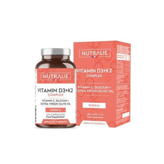 Nutralie Complexe Vitamine D3+K2 10000 UI + Vitamine C 60 gélules molles est un complément alimentaire formulé avec de l'huile d'olive, de la vitamine C, de la vitamine D3 et de la vitamine K2.