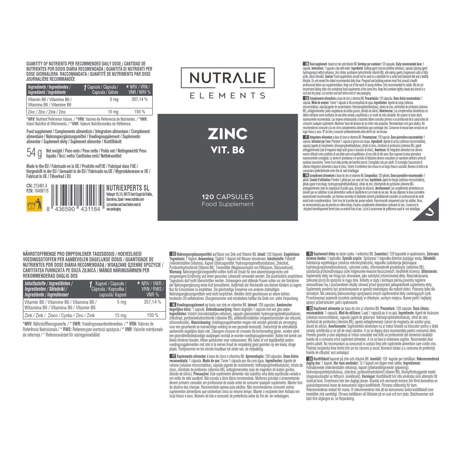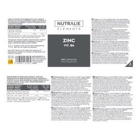 Nutralie Zinc + Vitamine B6 Acné Cheveux Peau Végétalien 120caps est un complément alimentaire formulé avec du zinc et de la vitamine B6.