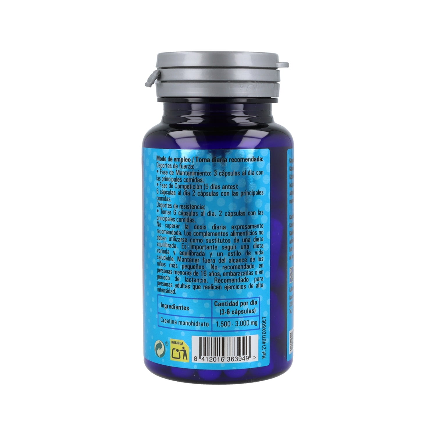 Créatine monohydrate (500mg), Agent de charge (amidon de maïs), Antiagglomérants (phosphate de calcium, cellulose, stéarate de magnésium).