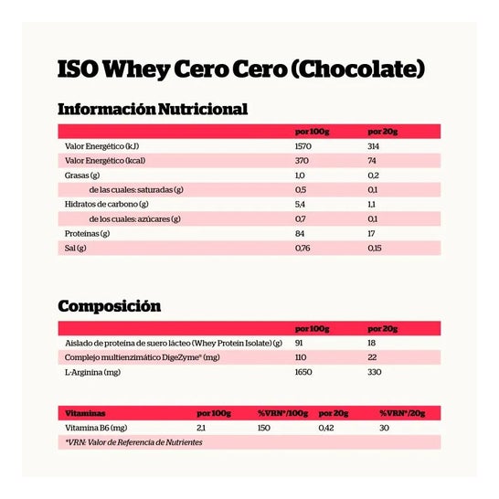 Avec des saveurs : Isolat de protéines de lactosérum (91%)1 (97%)2, 3, 4, 5 Acidulants (acide citrique, acide malique)3, 4, arômes, poudre de cacao sans graisse (2, 5%)1, épaississant (gomme xanthane), Édulcorants (acésulfame de potassium, cyclamate de sodium1, sucralose2, 3, 4, 5), chlorure de sodium1, colorants (E-1202, E-1023, E-1104, E-150A5), vitamine B6 (chlorhydrate de pyridoxine).