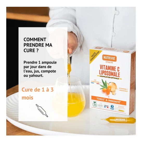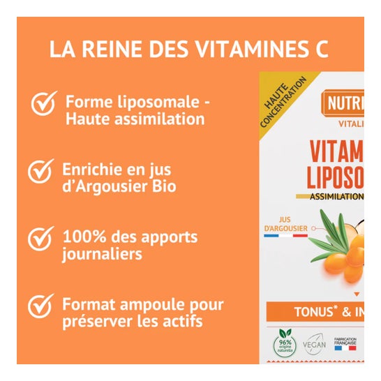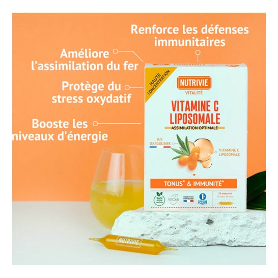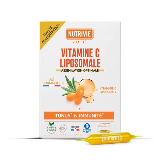 Nutrivie Ampoules Vitamine C Liposomale 20x15ml est un complément alimentaire à base de vitamine C liposomale offrant une assimilation optimale pour soutenir l’immunité et l’énergie.